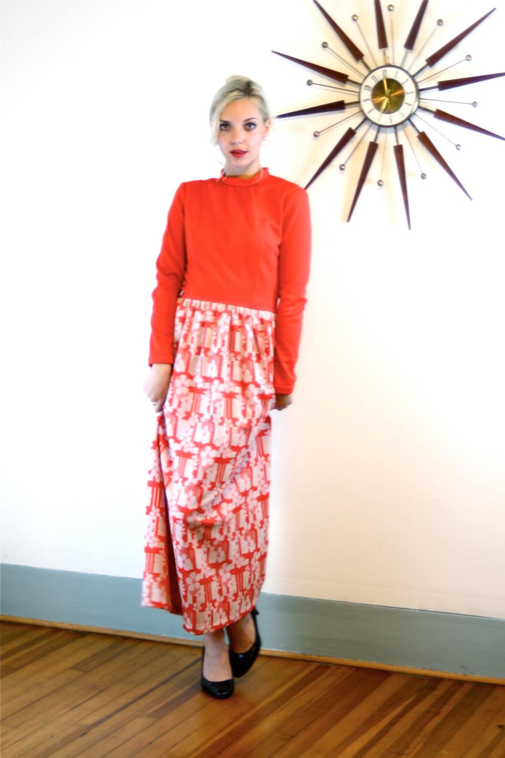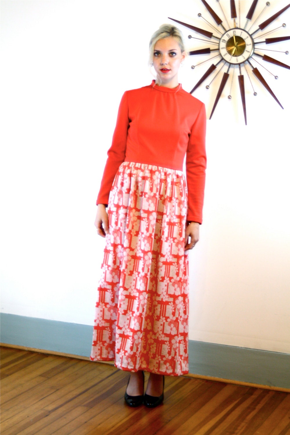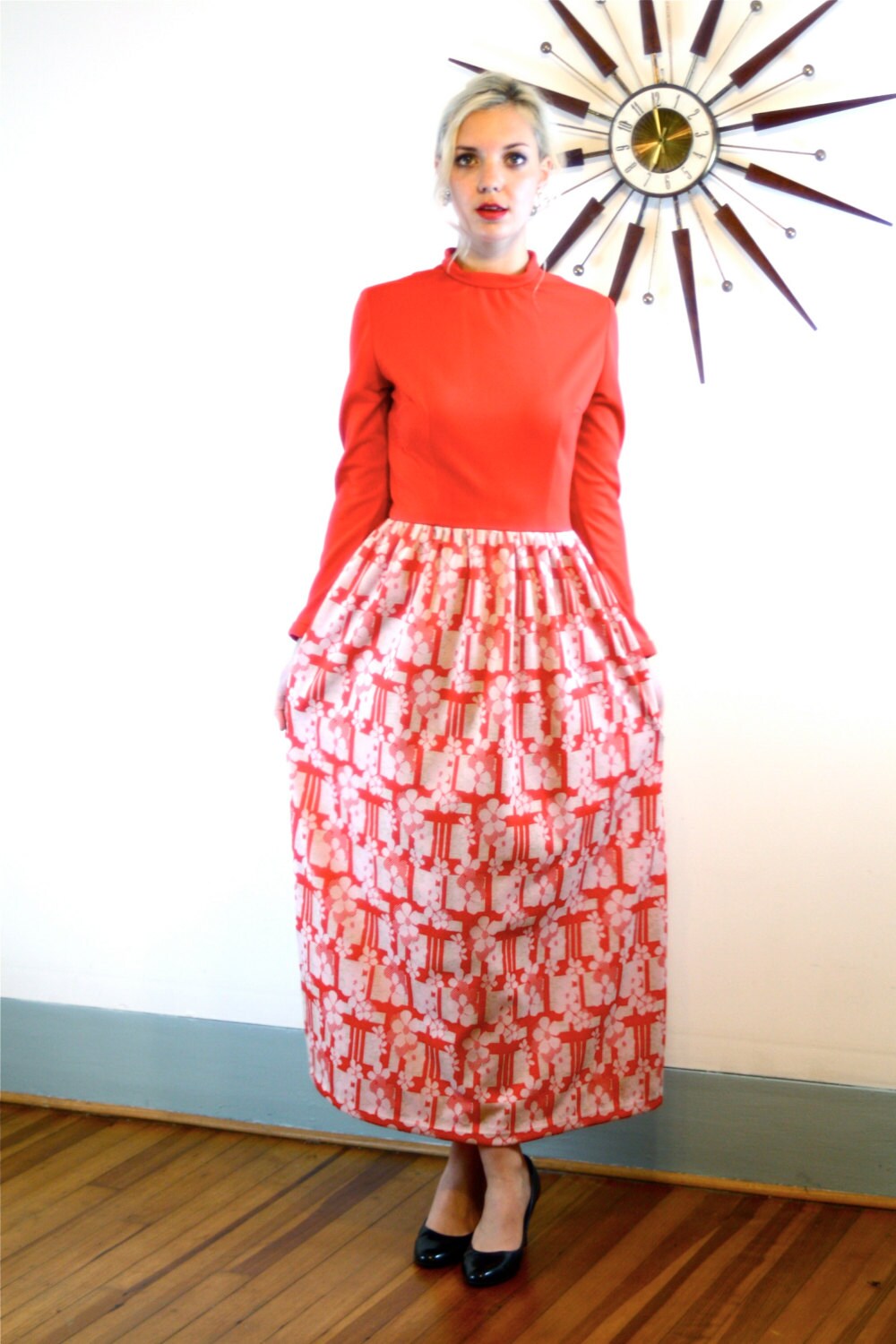 1970s Maxi Dress, Long Hippie Dress, Vintage Maxi Dress, Bright Red Dress, Long Sleeve Maxi, High Collar dress, 60s maxi dress, 70s maxi dress, MAD MEN fashion, 70s Loungewear