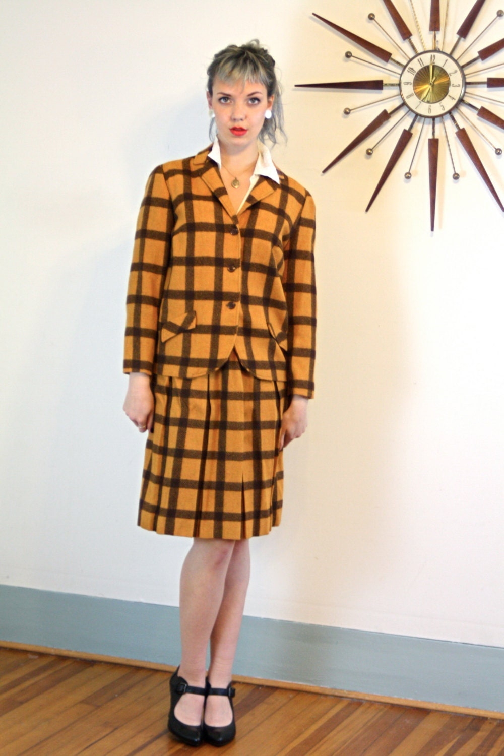 This is a spectacular vintage 1960s dark brown and ocher yellow/orange wool plaid jacket and skirt set! Beautiful retro cut with a Peter Pan collar jacket, and a pleated skirt. I love the retro colors!