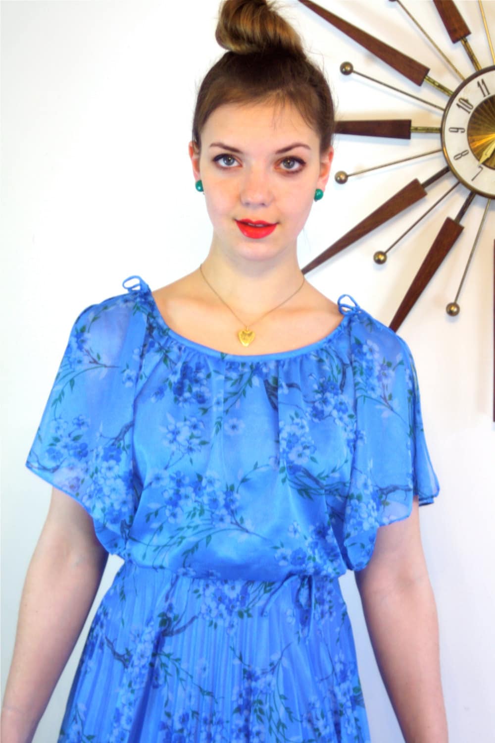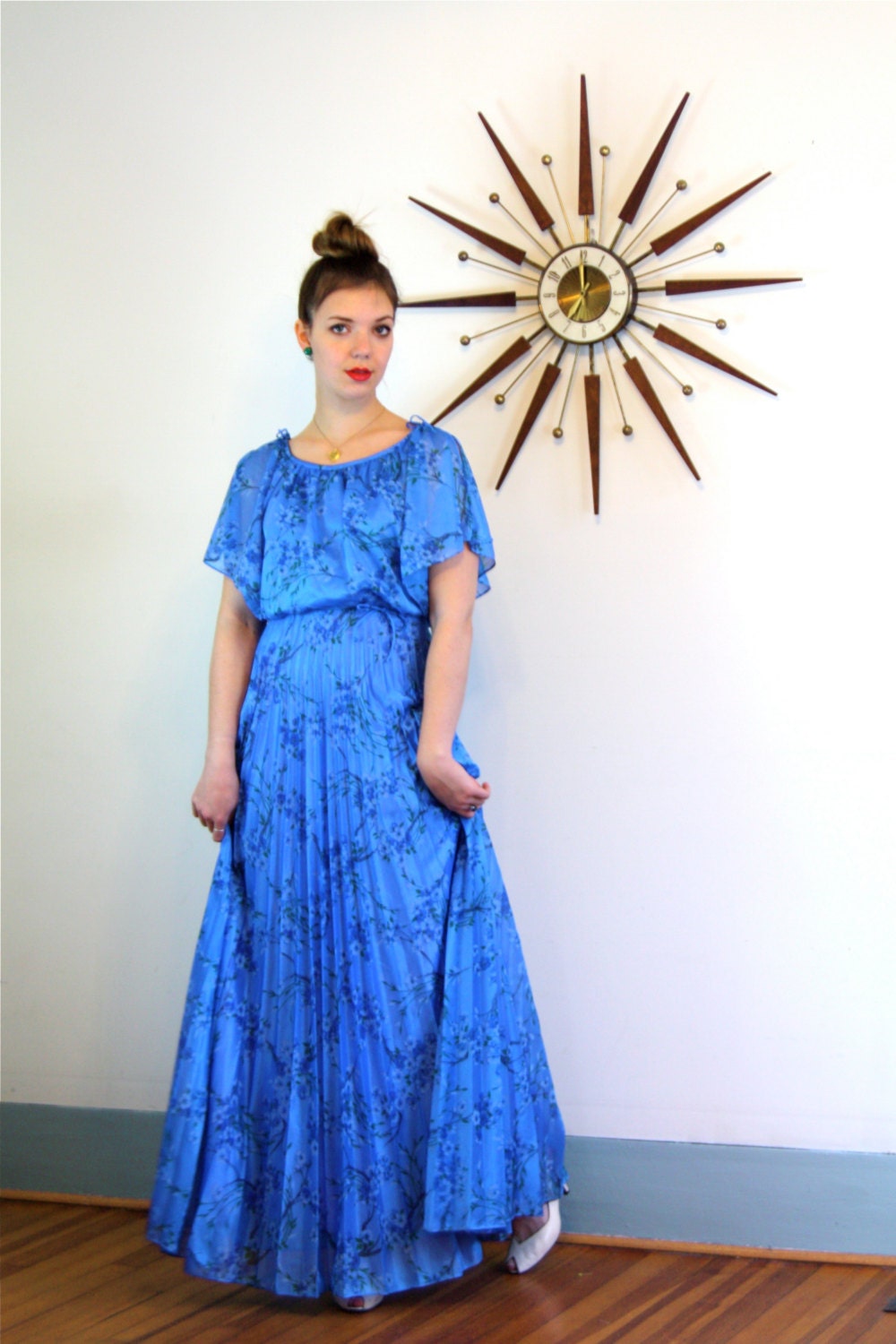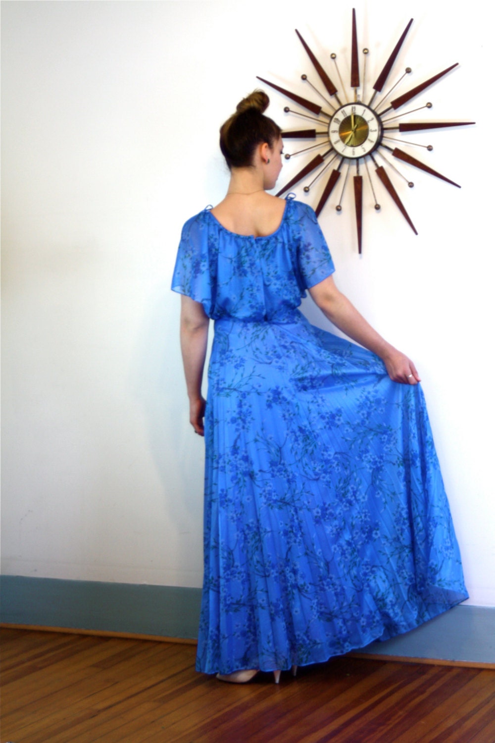 This vintage 70s blue floral maxi dress is so pretty! Such beautiful pattern with lovely flowing pleats on the full skirt! This long dress has flutter sleeves the have little bows and are open to show the shoulder. at the bust and hem! This dress zips up the back, and is lined in the skirt with satin.