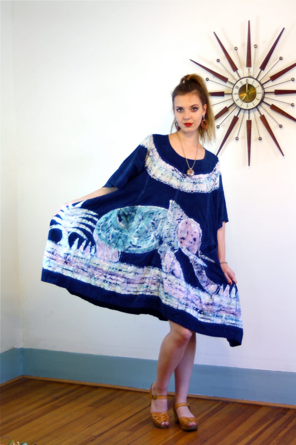 Vintage 70s dress, Tie Dye Kaftan, African print dress,Cotton Tent dress,Hippie kaftan, Big Mu Mu, Blue Pink White, handmade Batik, Elephant Pattern, Boho Caftan, 1970s Loungewear, beach coverup