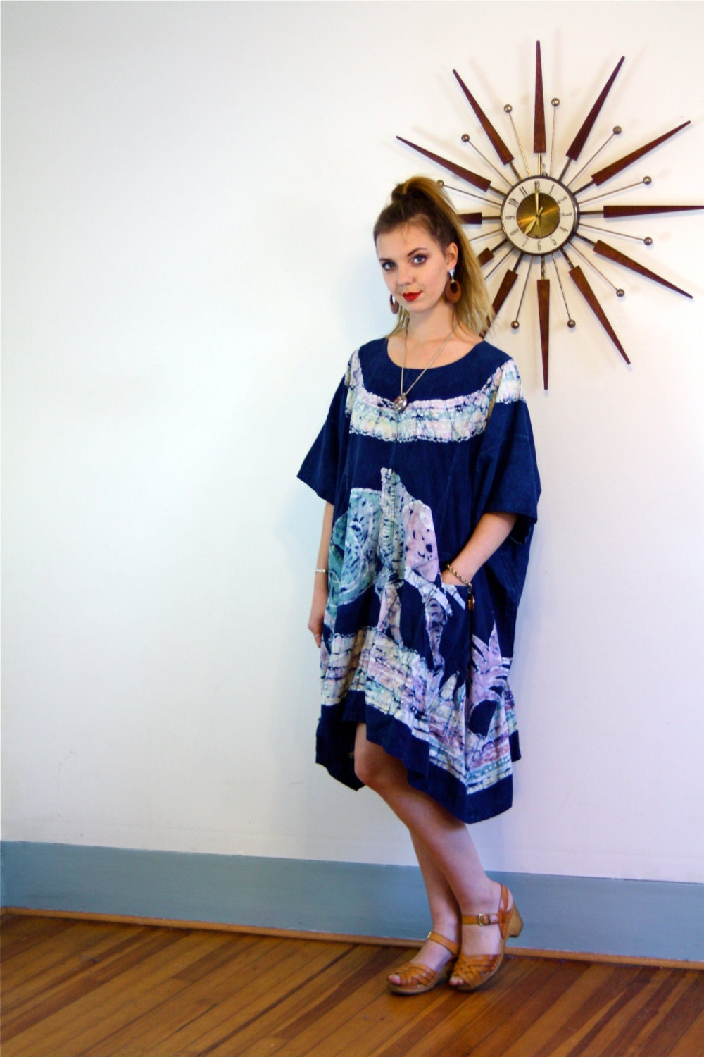 Vintage 70s Tie Dye Kaftan African Dashiki Cotton Hippie Tent Dress Blue Pink White Batik Elephant Pattern Caftan 1970s Coverup Loungewear