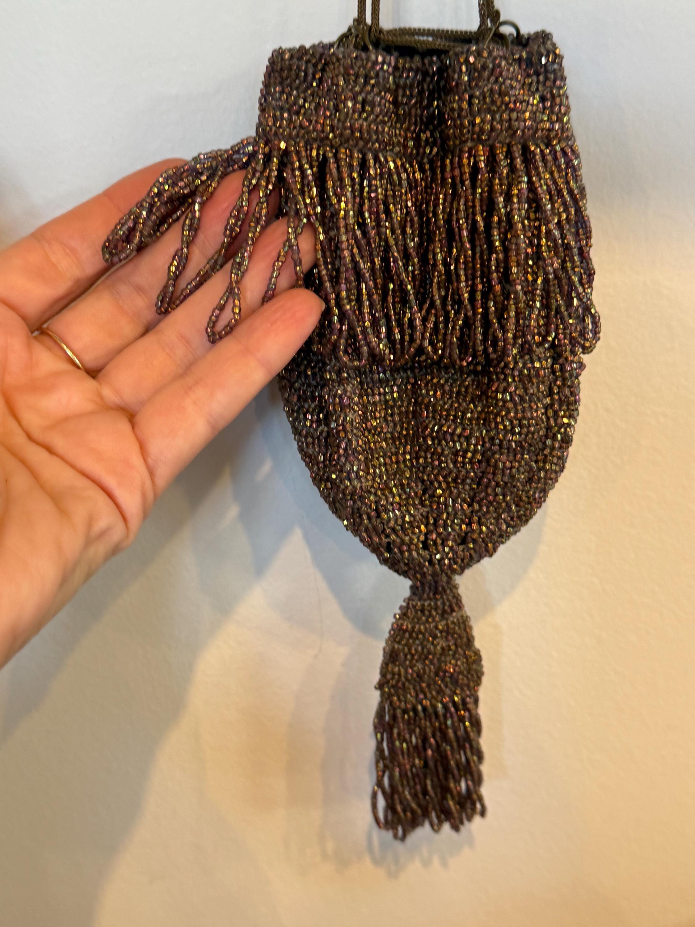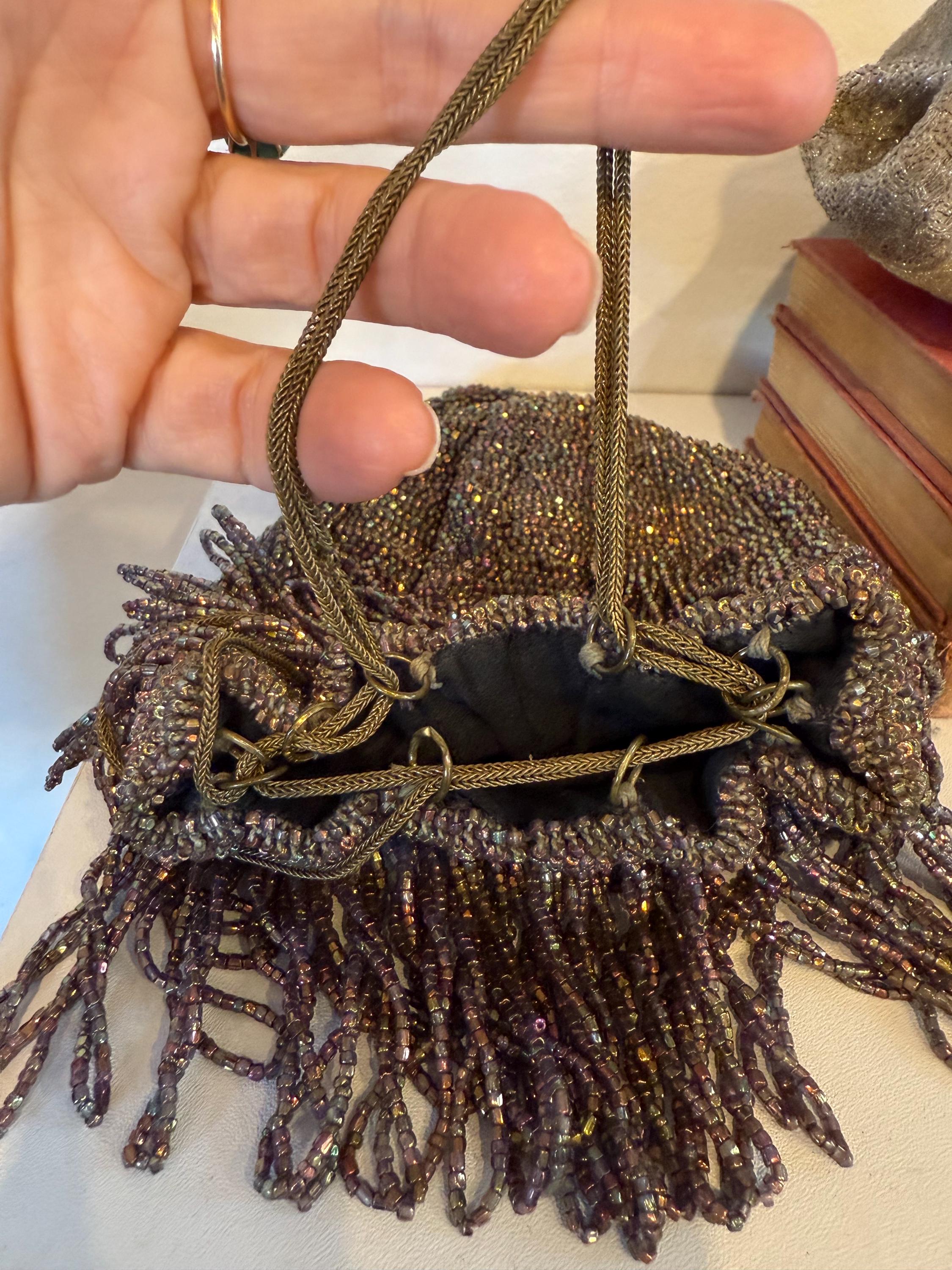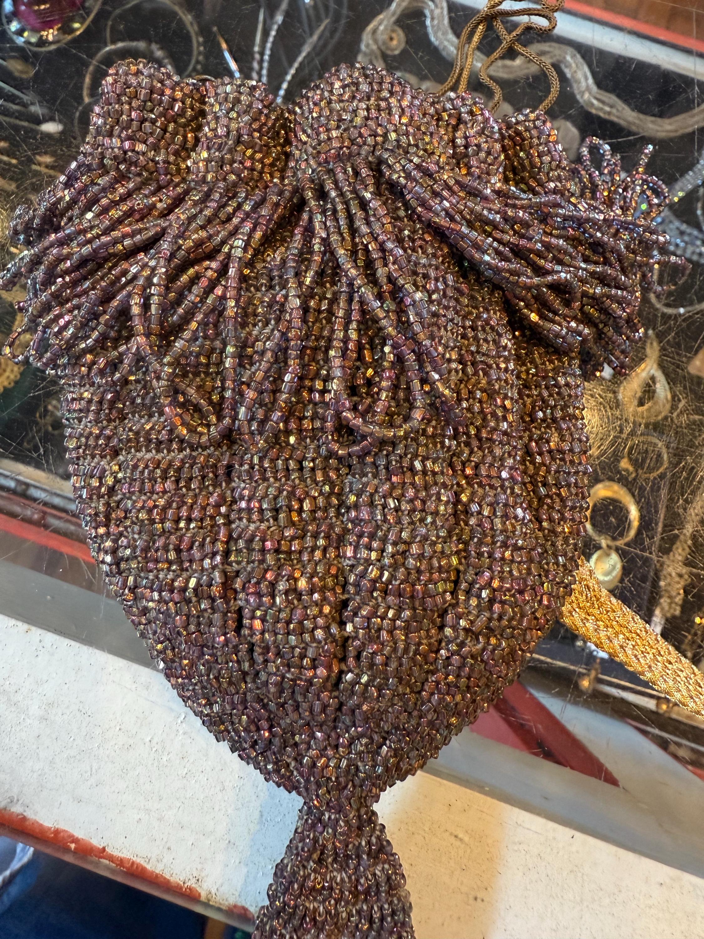 This Antique hand beaded wrist purse is absolutely stunning! It is covered in aurora borealis, opalescent gold, copper and bronze colored beads with a lovely long tassel. It has every bead in place and has the most lovely bronze drawstring strap!