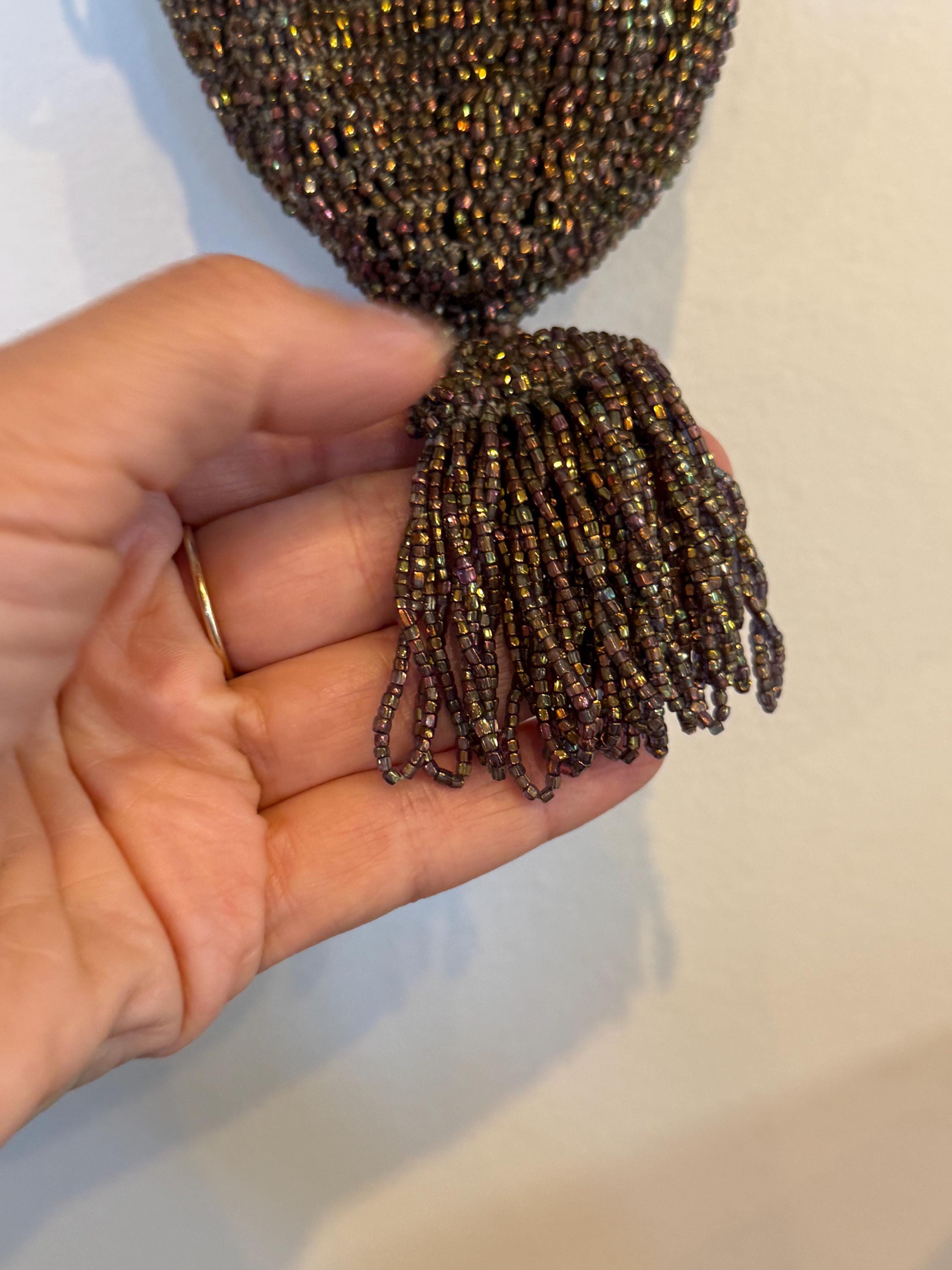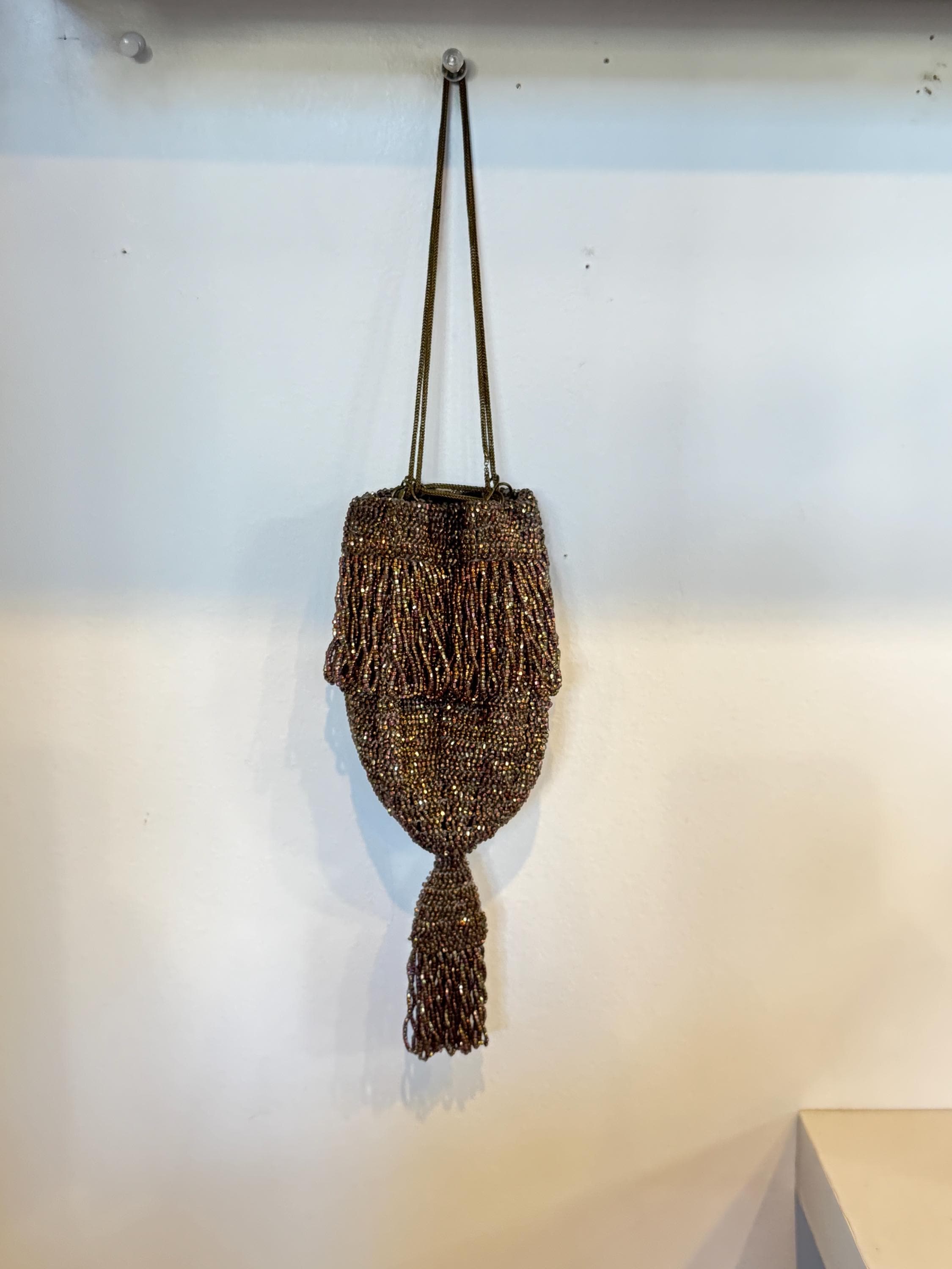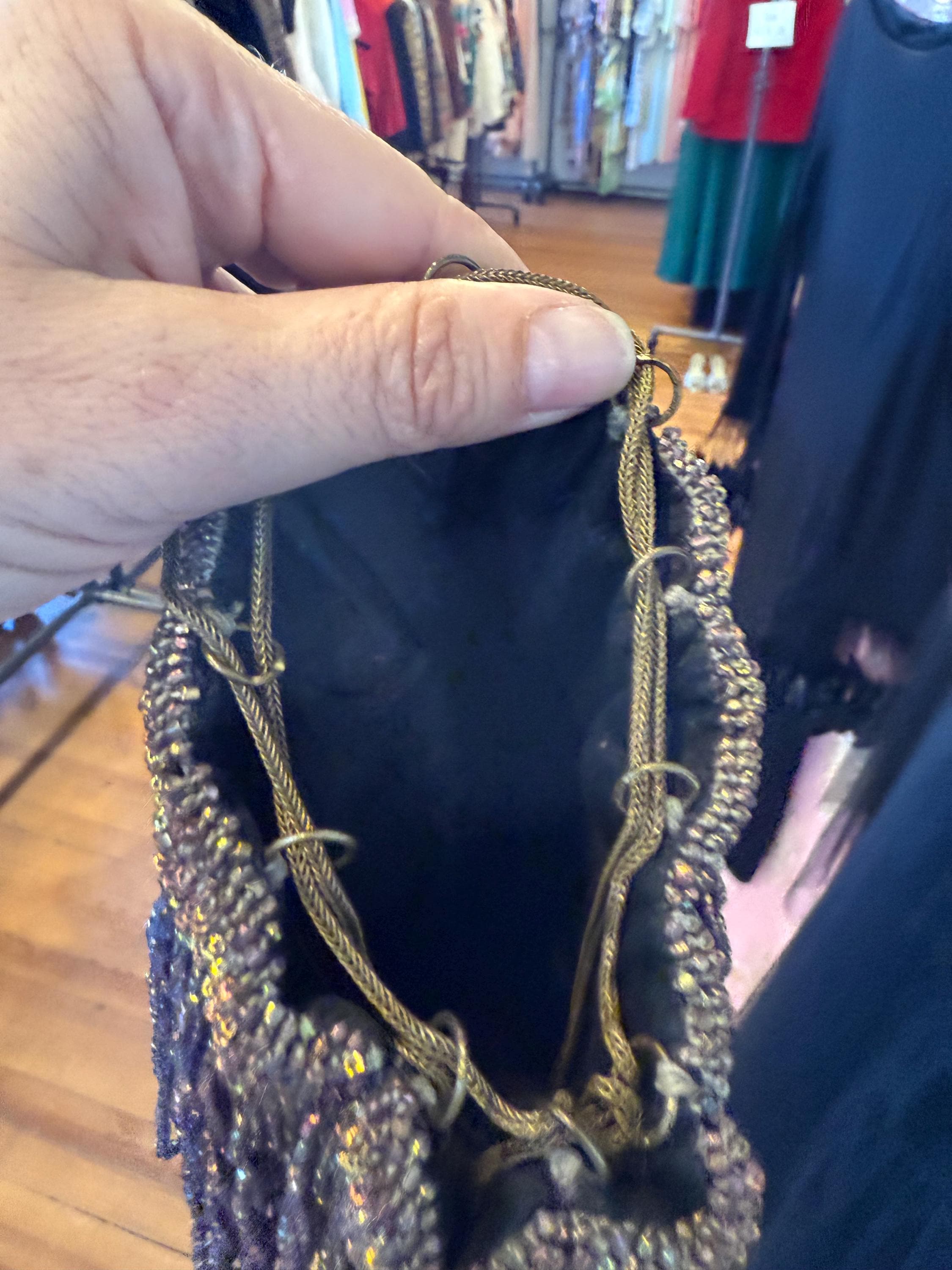 This Antique hand beaded wrist purse is absolutely stunning! It is covered in aurora borealis, opalescent gold, copper and bronze colored beads with a lovely long tassel. It has every bead in place and has the most lovely bronze drawstring strap!