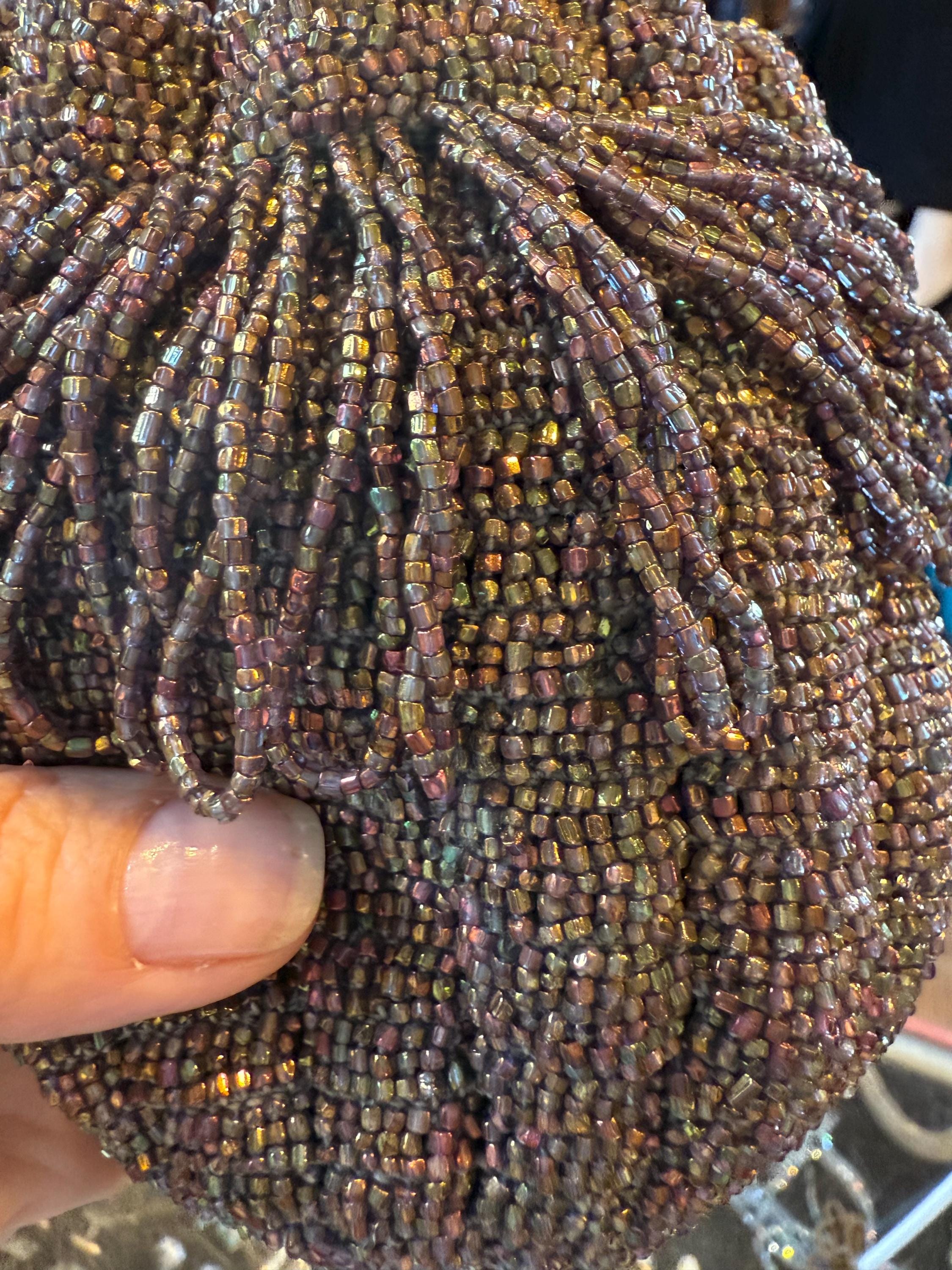 Materials: shiny, opalescent gold, copper and bronze tone beads. Satin inner lining and bronze metal drawstring strap.