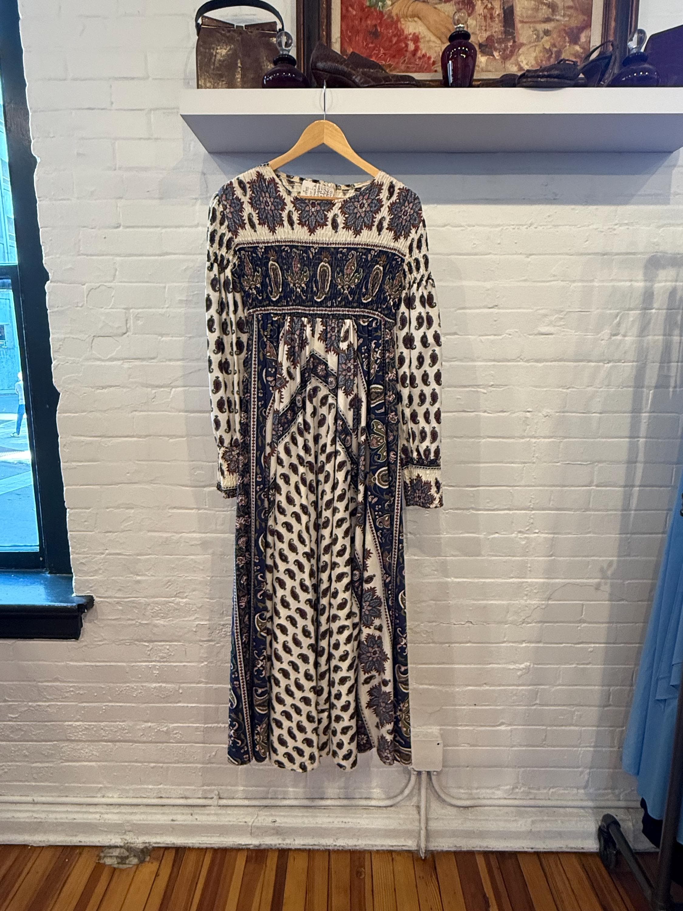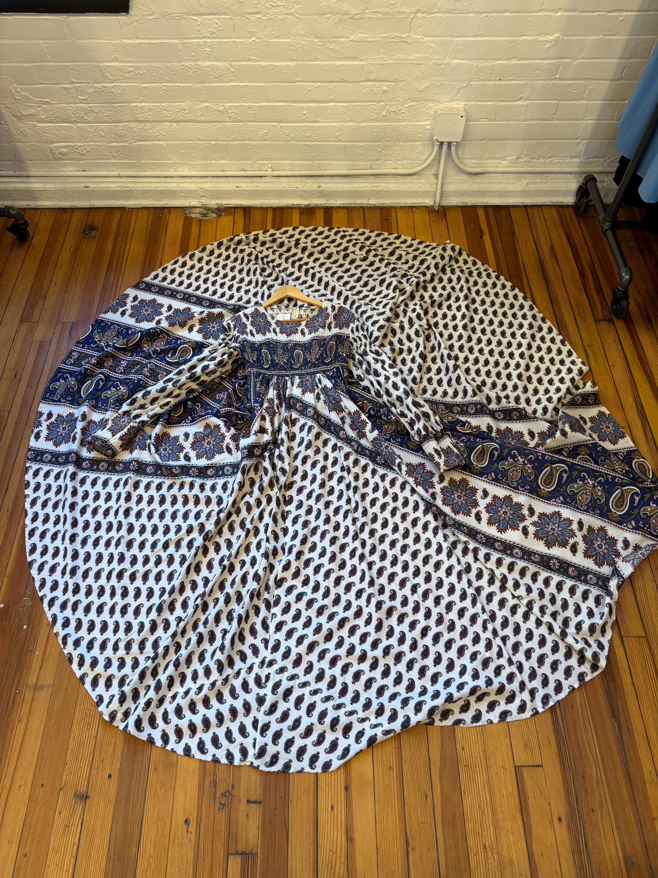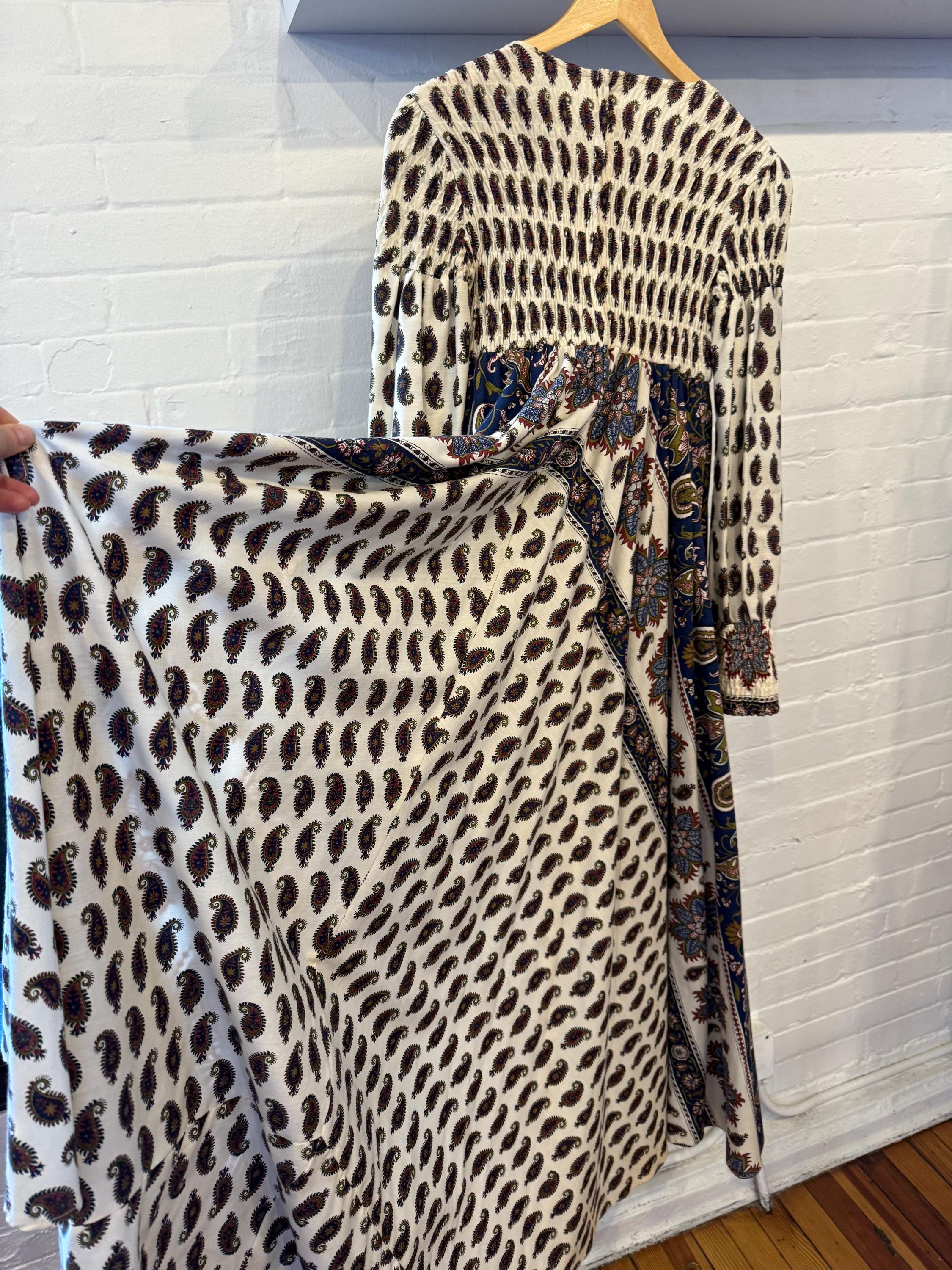 1970s paisley smocked cotton dress, Vintage 70s long sleeve maxi dress, 70s long sleeve full circle skirt maxi dress, 1970s maxi dress w/ ruching