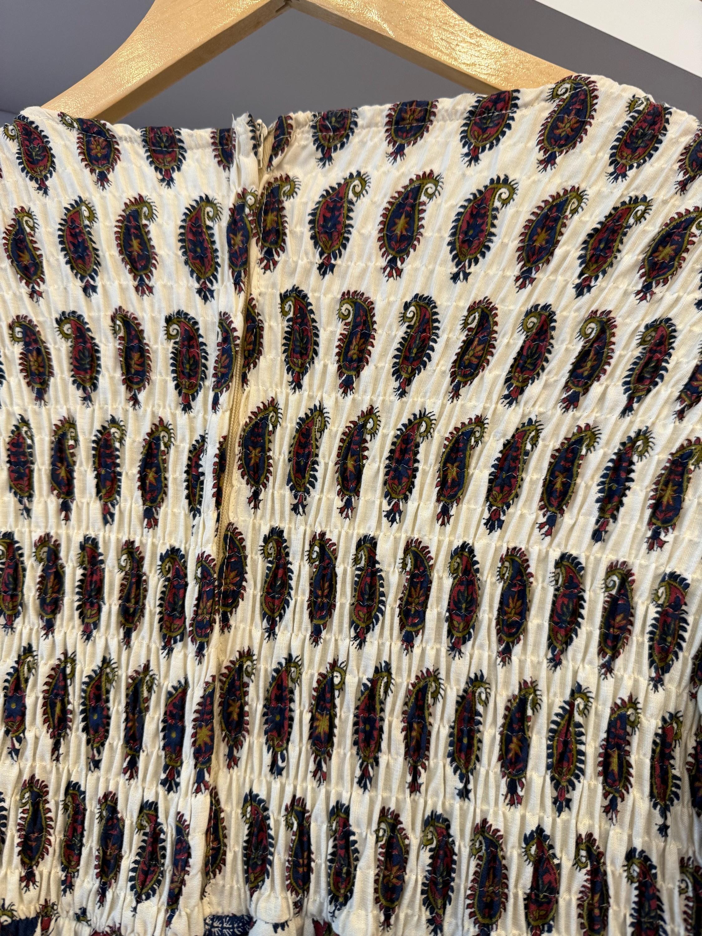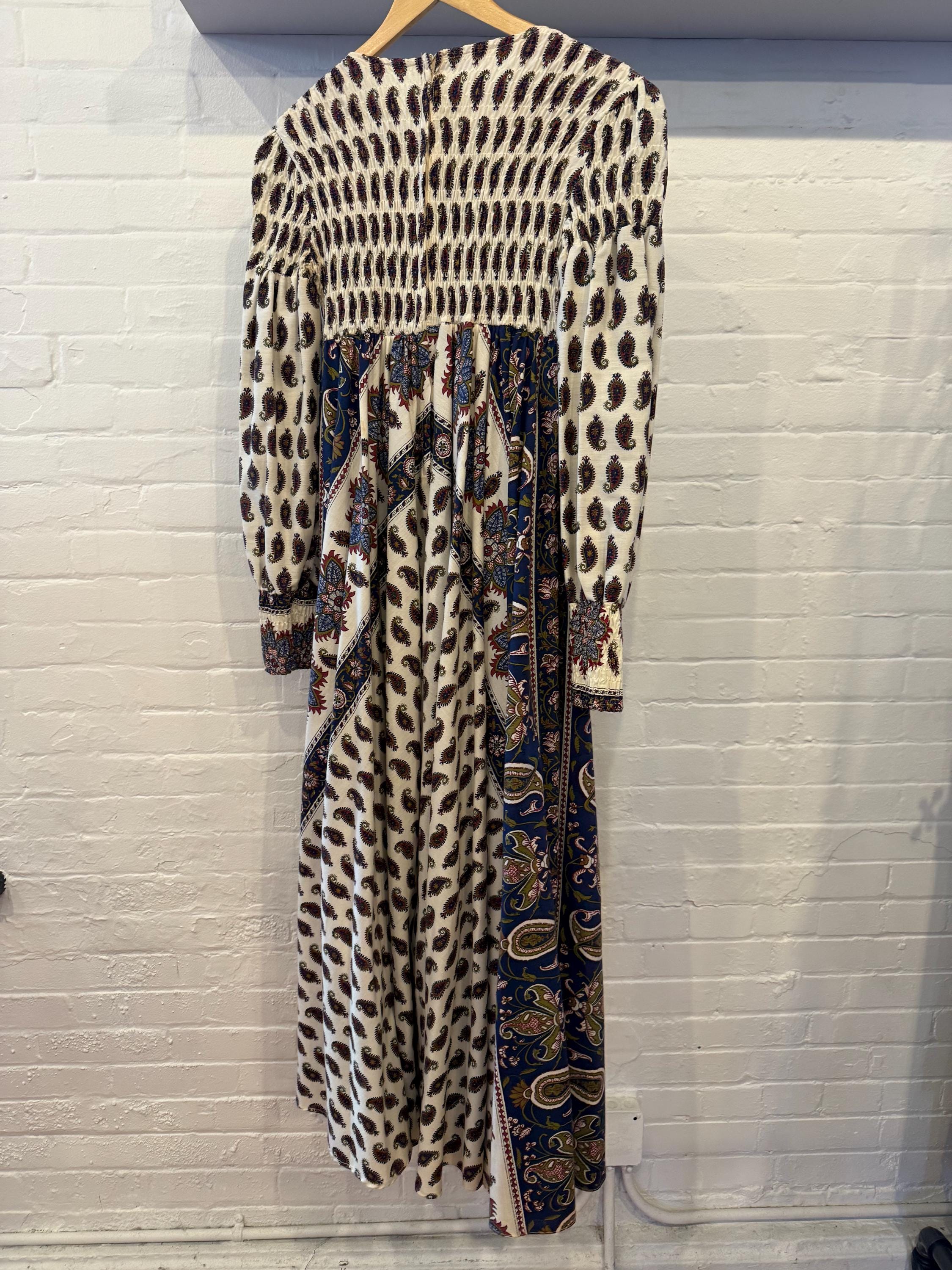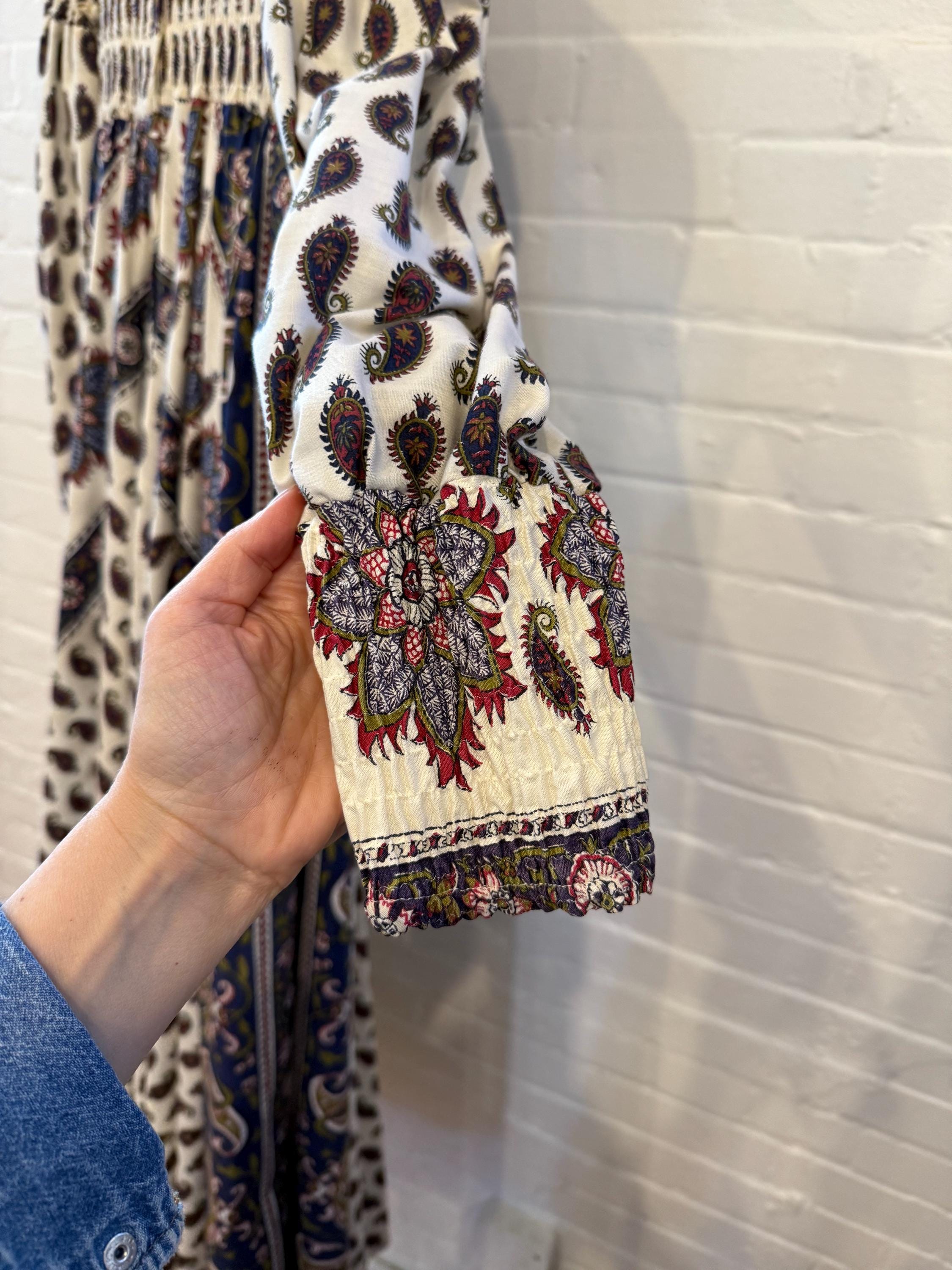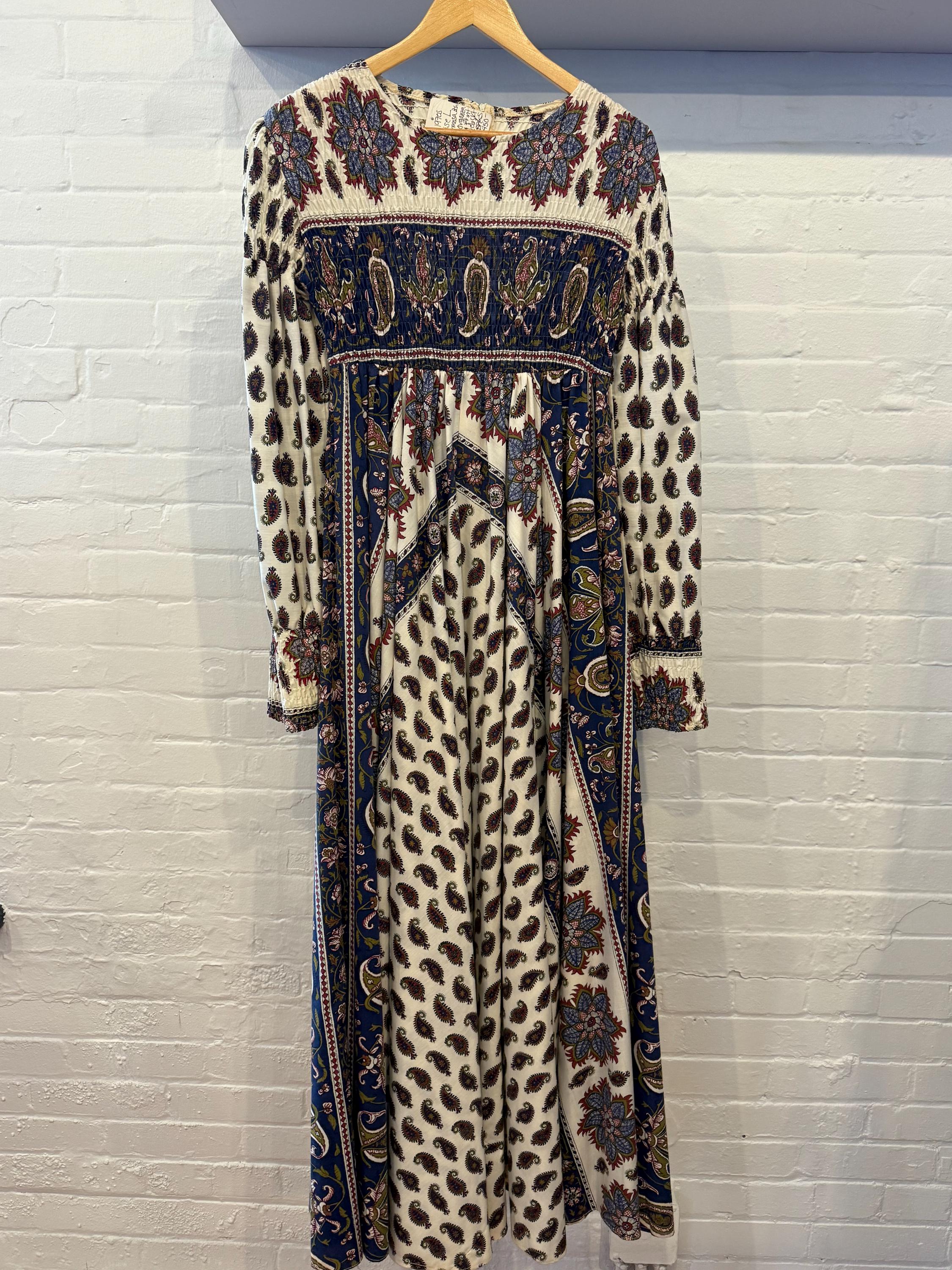 1970s paisley smocked cotton dress, Vintage 70s long sleeve maxi dress, 70s long sleeve full circle skirt maxi dress, 1970s maxi dress w/ ruching