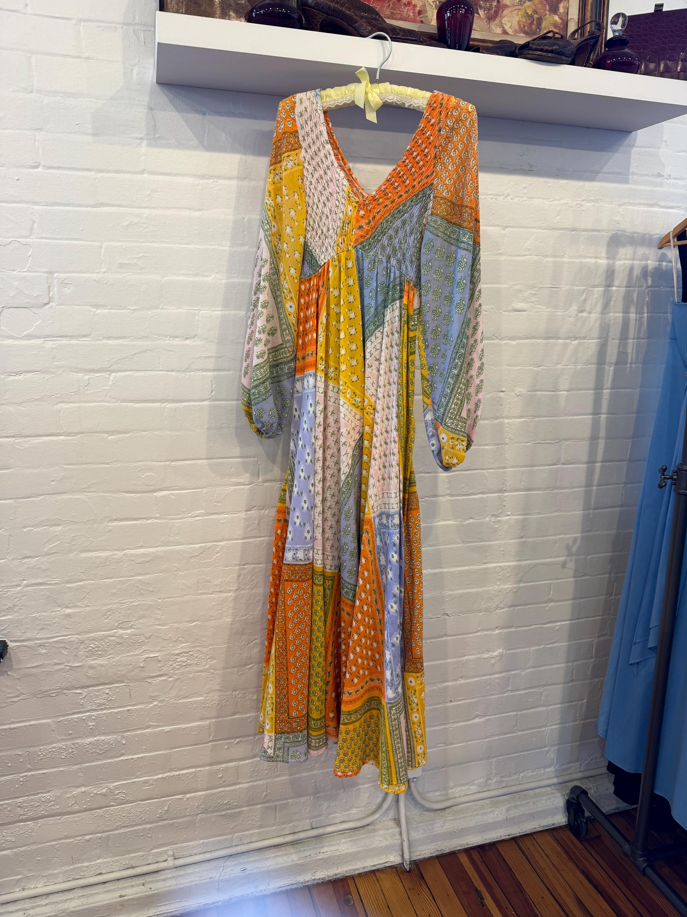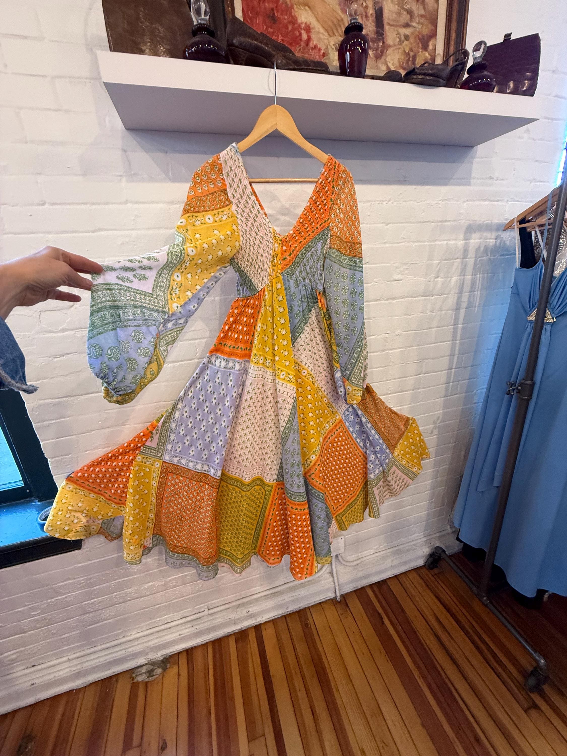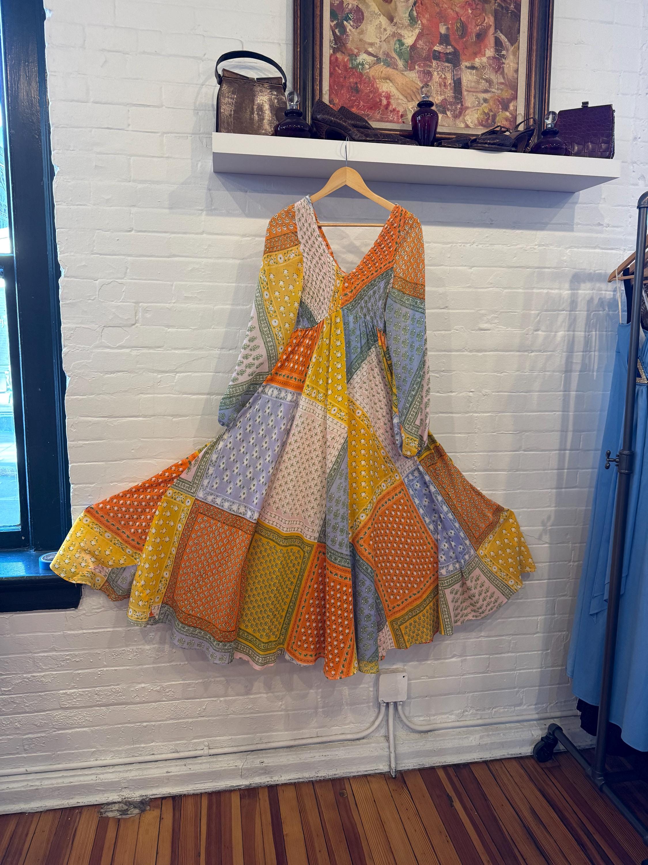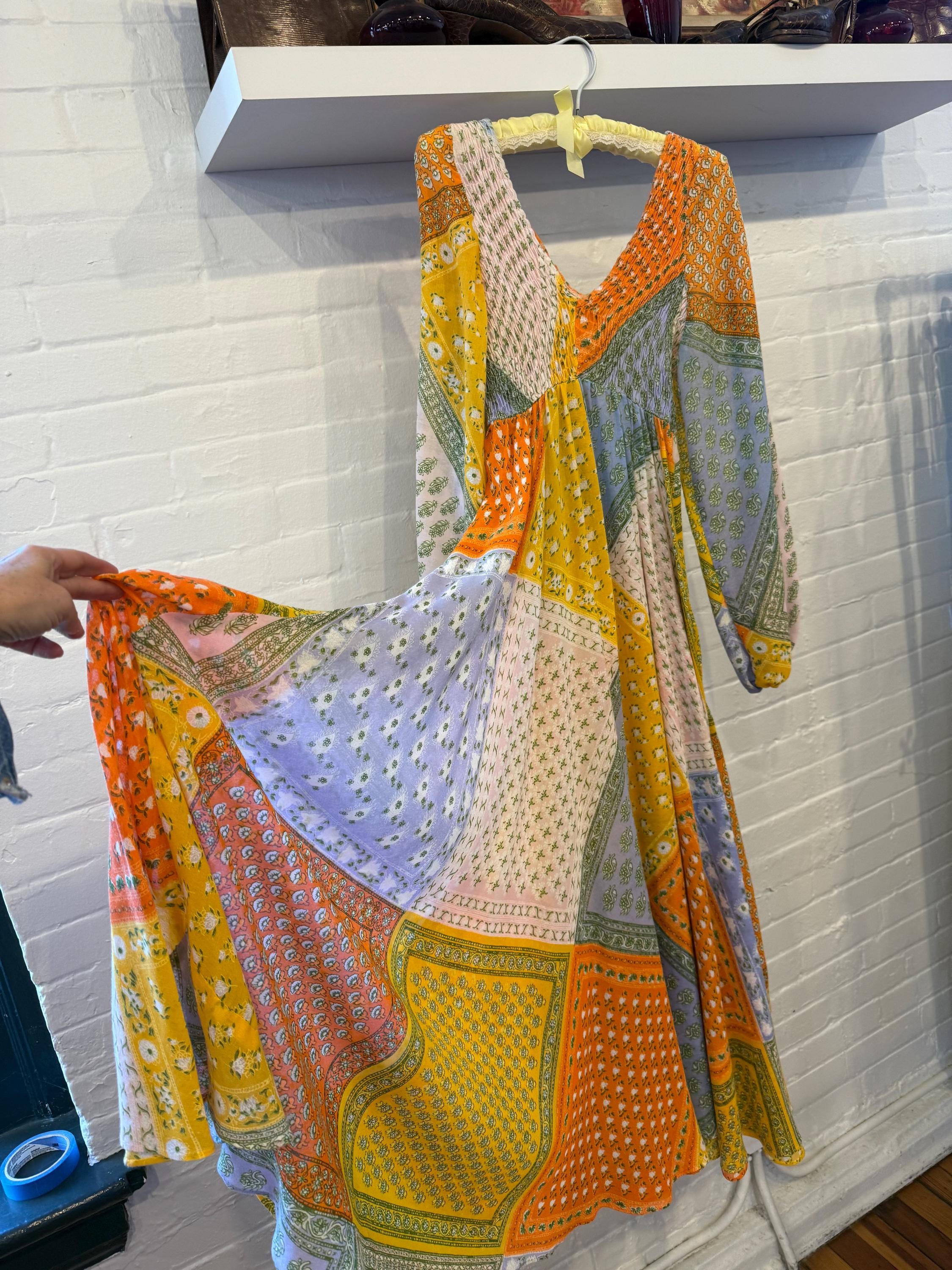 Super rare Denise L of Hermosa Beach California patchwork maxi dress! This bright and colorful paisley patch work vintage 1970s maxi is a collectors Item and rarely found these days! Full circle skirt with smocking on the bust and long sleeves for a stunning boho puff poet sleeve. The rainbow of colors include orange, pink, purple, blue, green and yellow.