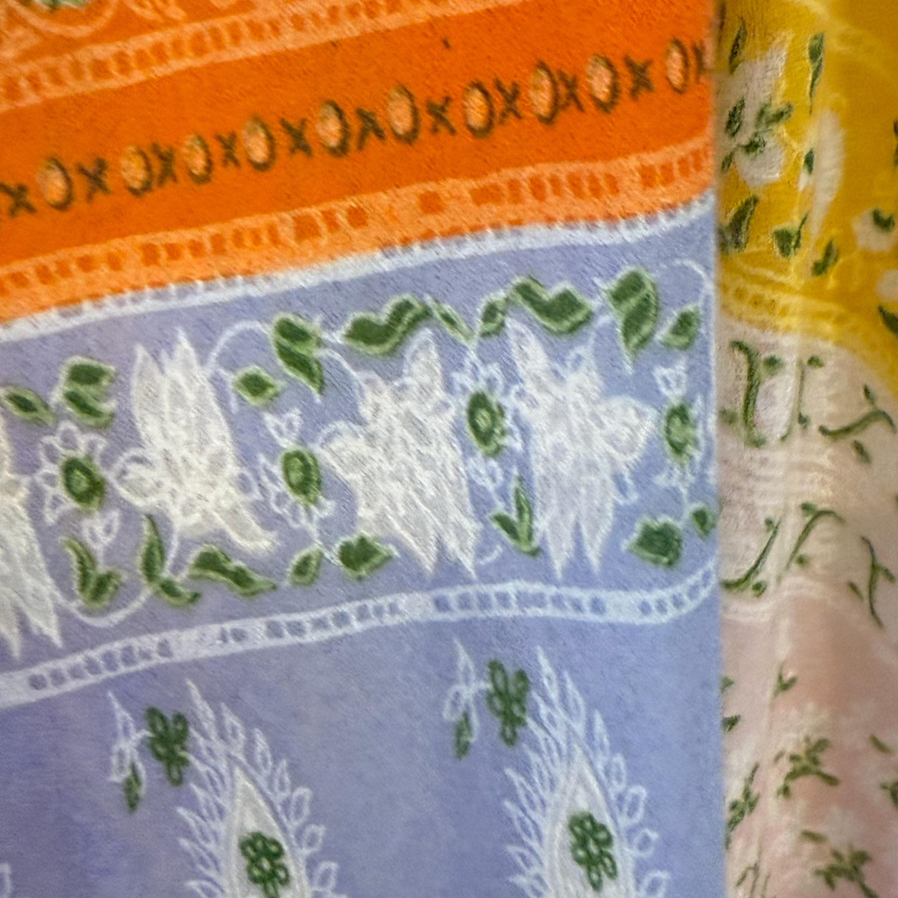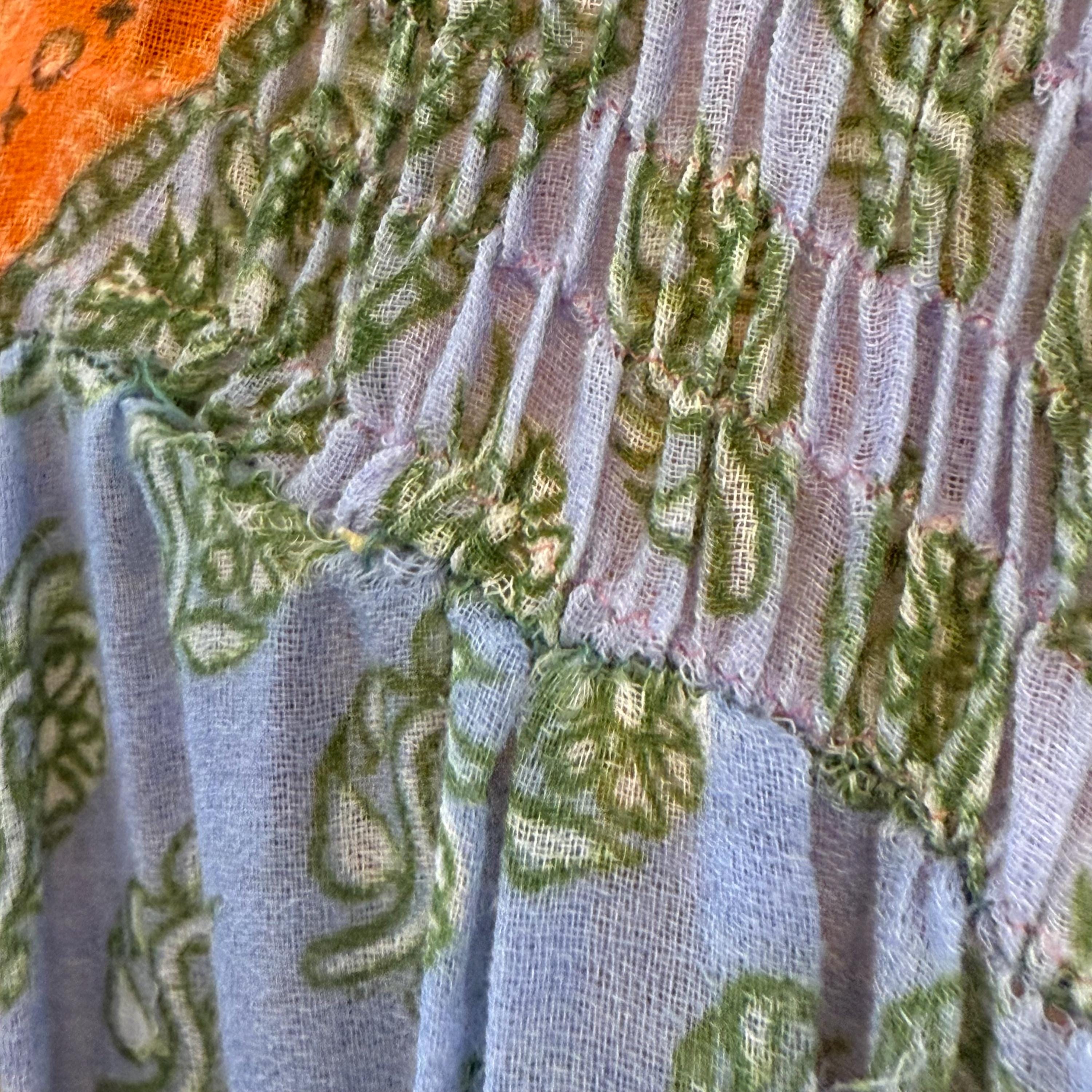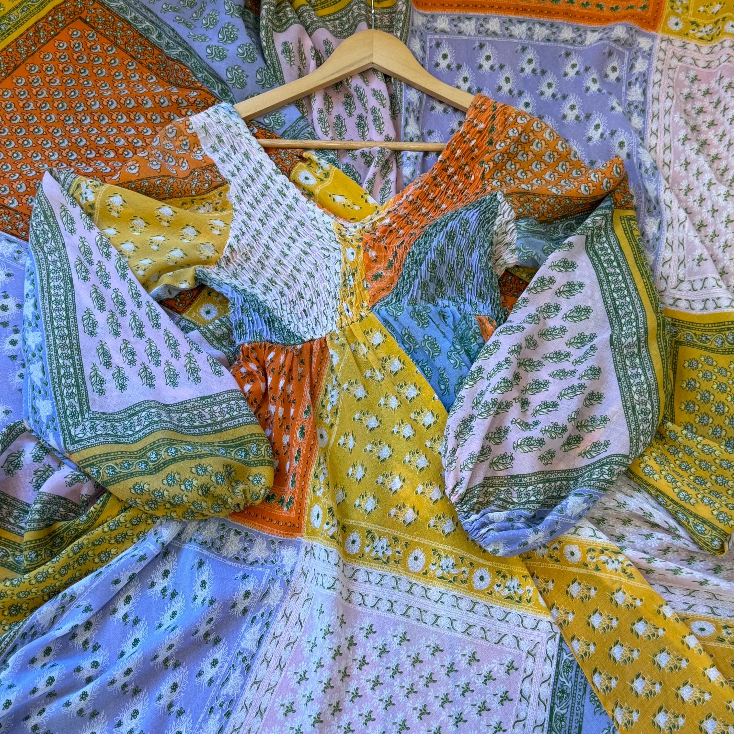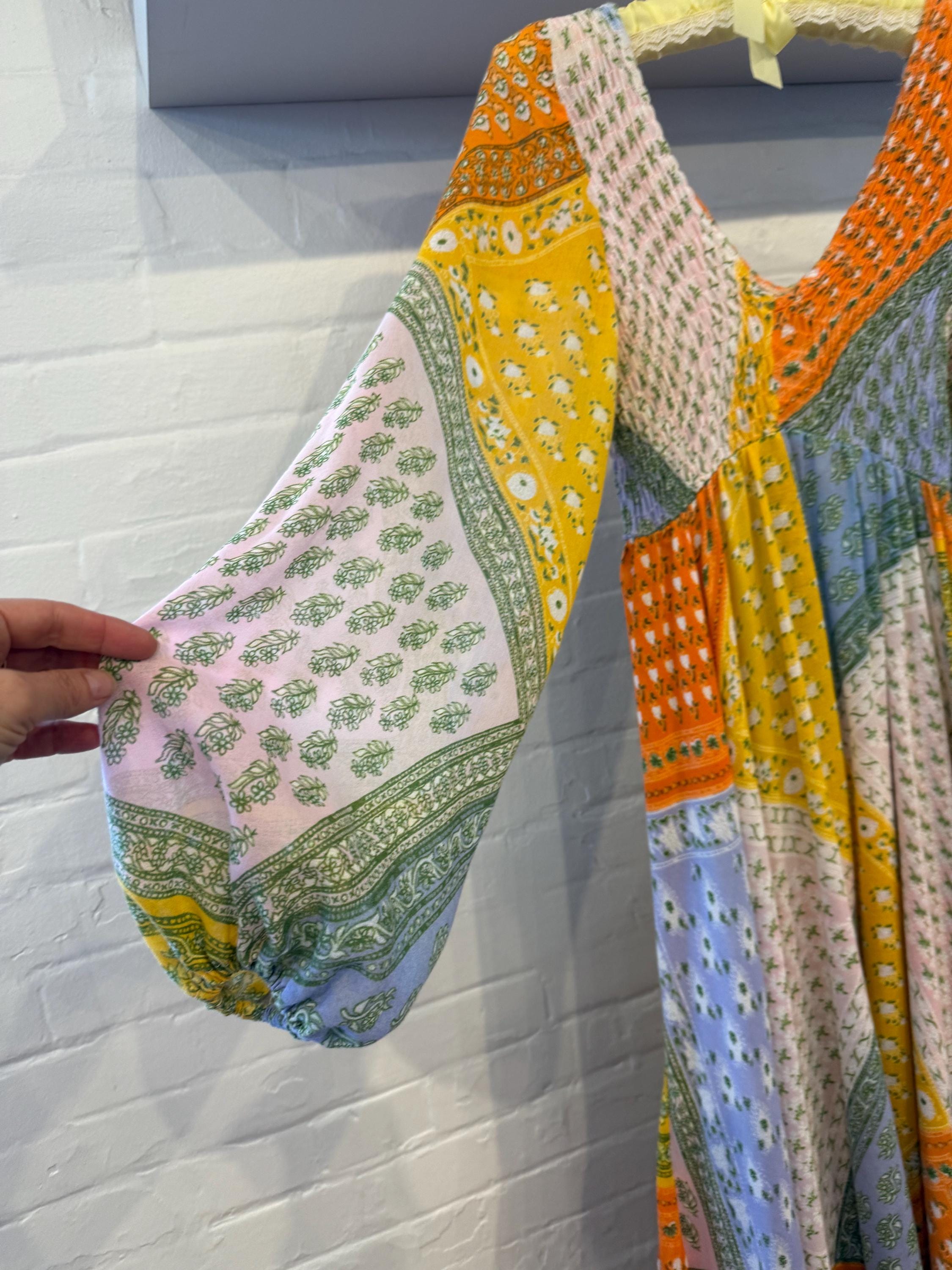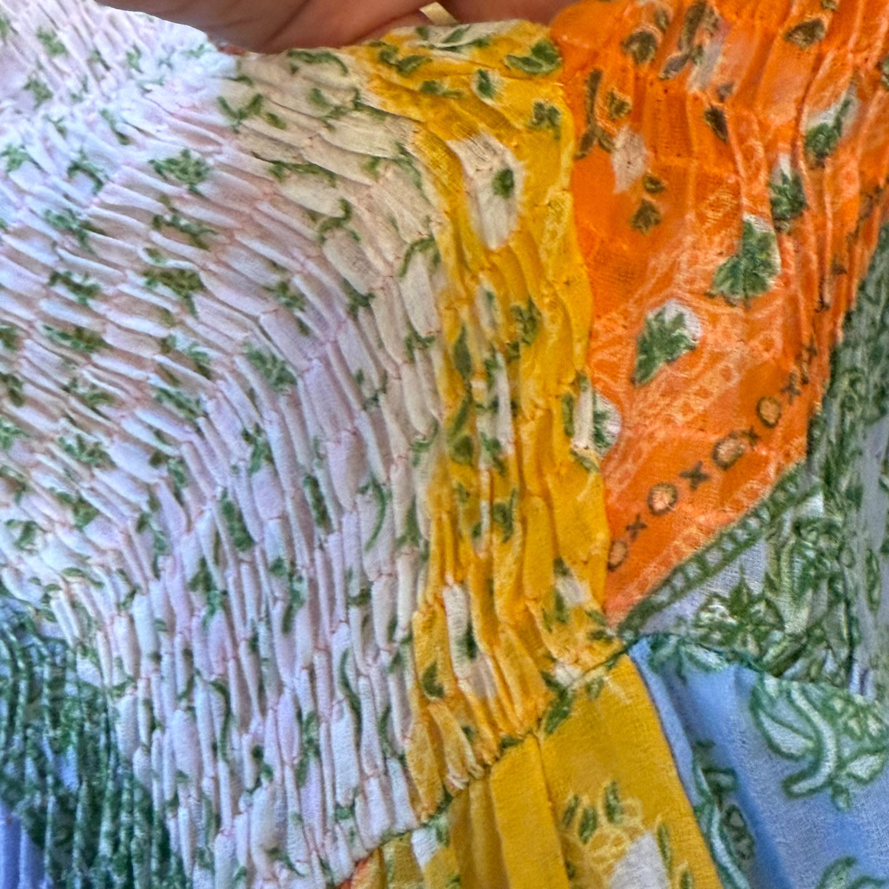 Super rare Denise L of Hermosa Beach California patchwork maxi dress! This bright and colorful paisley patch work vintage 1970s maxi is a collectors Item and rarely found these days! Full circle skirt with smocking on the bust and long sleeves for a stunning boho puff poet sleeve. The rainbow of colors include orange, pink, purple, blue, green and yellow.