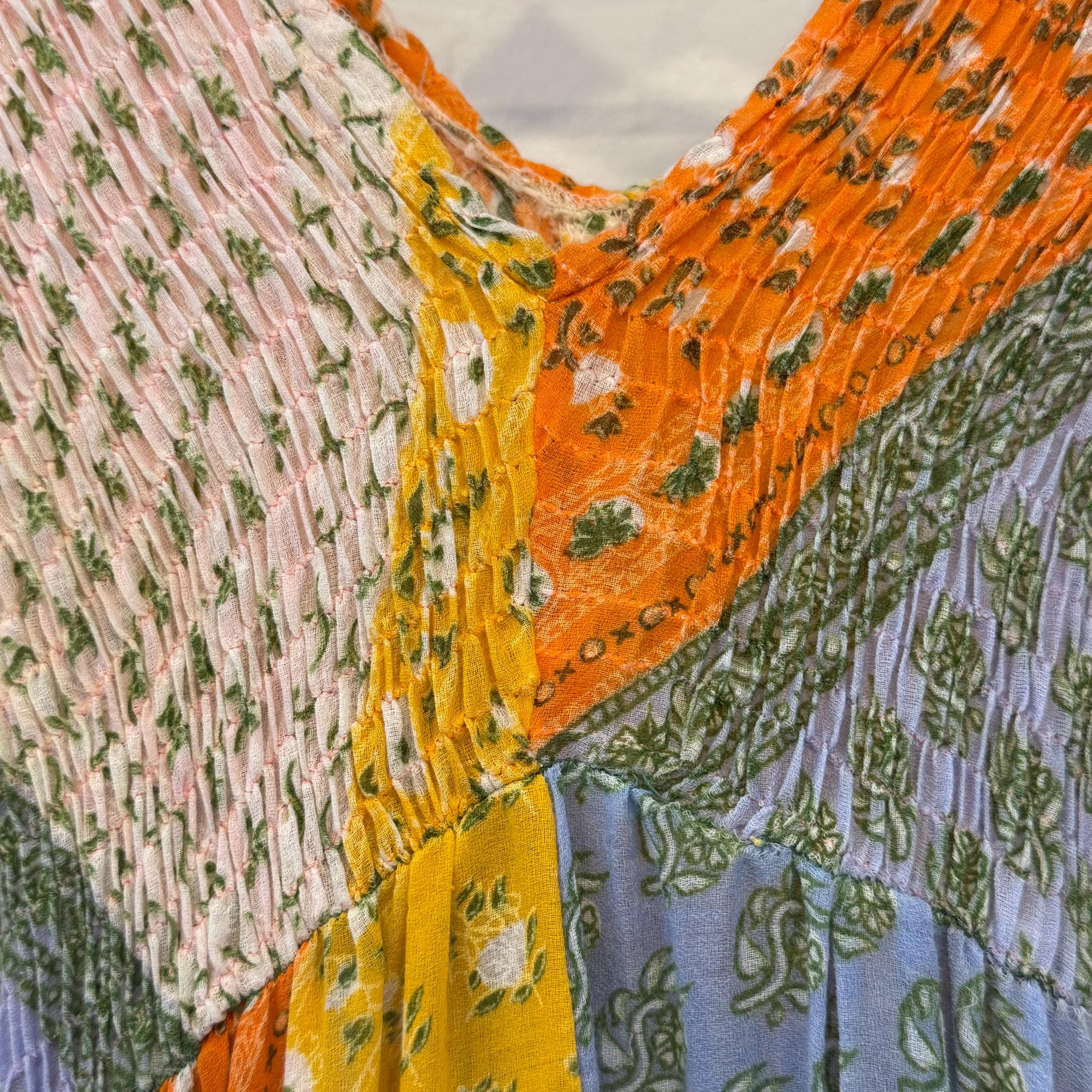 CONDITION: Great! Some of the stitching around the elastic ruching has come undone but does not affect the smocking (see last photo). The elastic still holds its stretch.