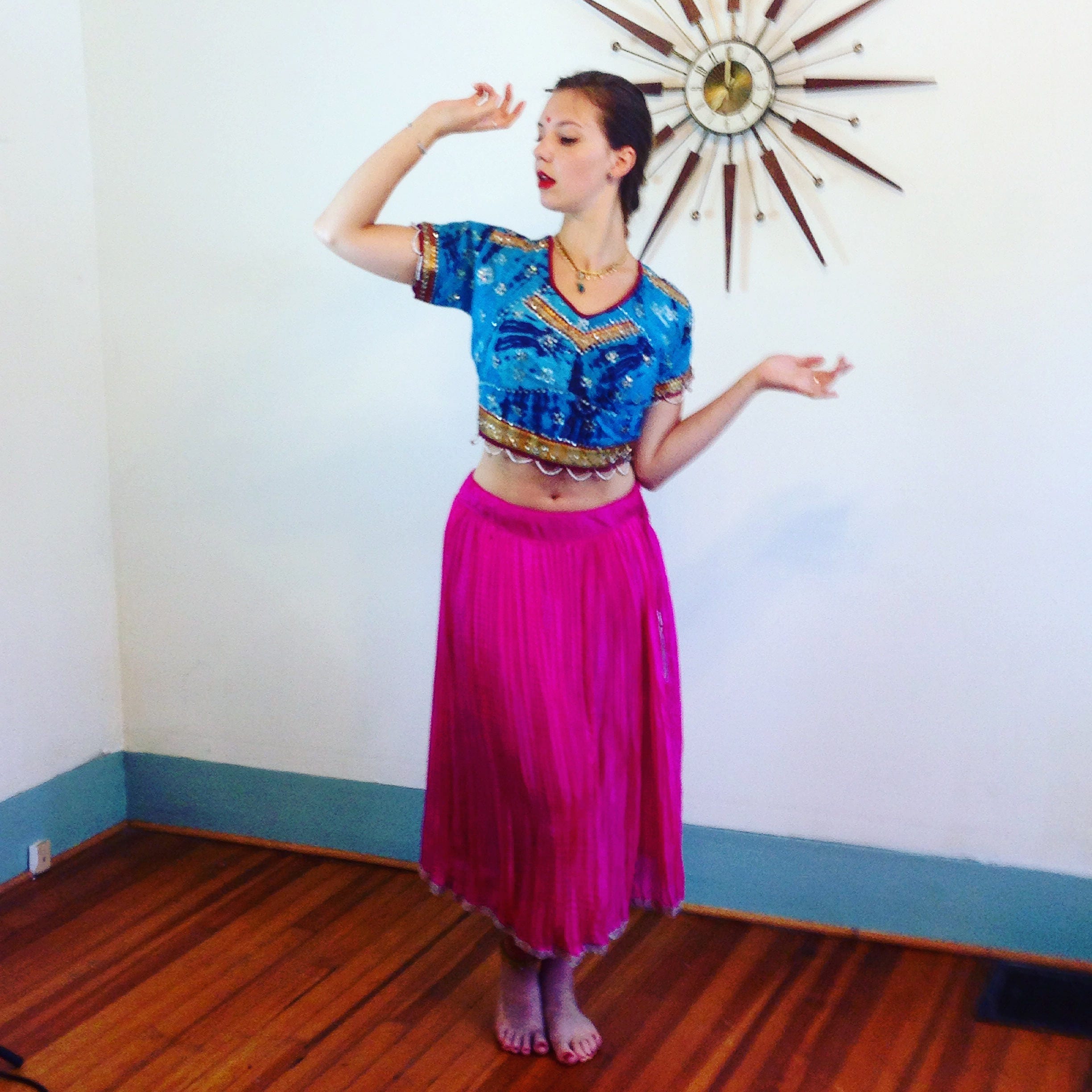 This is a stunning vintage Indian maxi skirt. This ethnic skirt is bright turquoise blue and orange cotton, with a traditional a bandhani, hand tie dyed pattern and mirrors stitched all over! This boho skirt is just breathtaking!