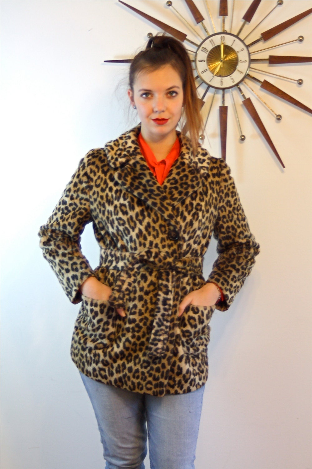 Super cute vintage 1960s faux leopard fur print jacket! This spotted cheetah pattern coat is lined with satin (see condition for details), with two front pockets. This 60s vegan/ faux animal fur jacket is furry and Cozy, but light weight! It has a little matching belt that looks cute as neck tie as well!