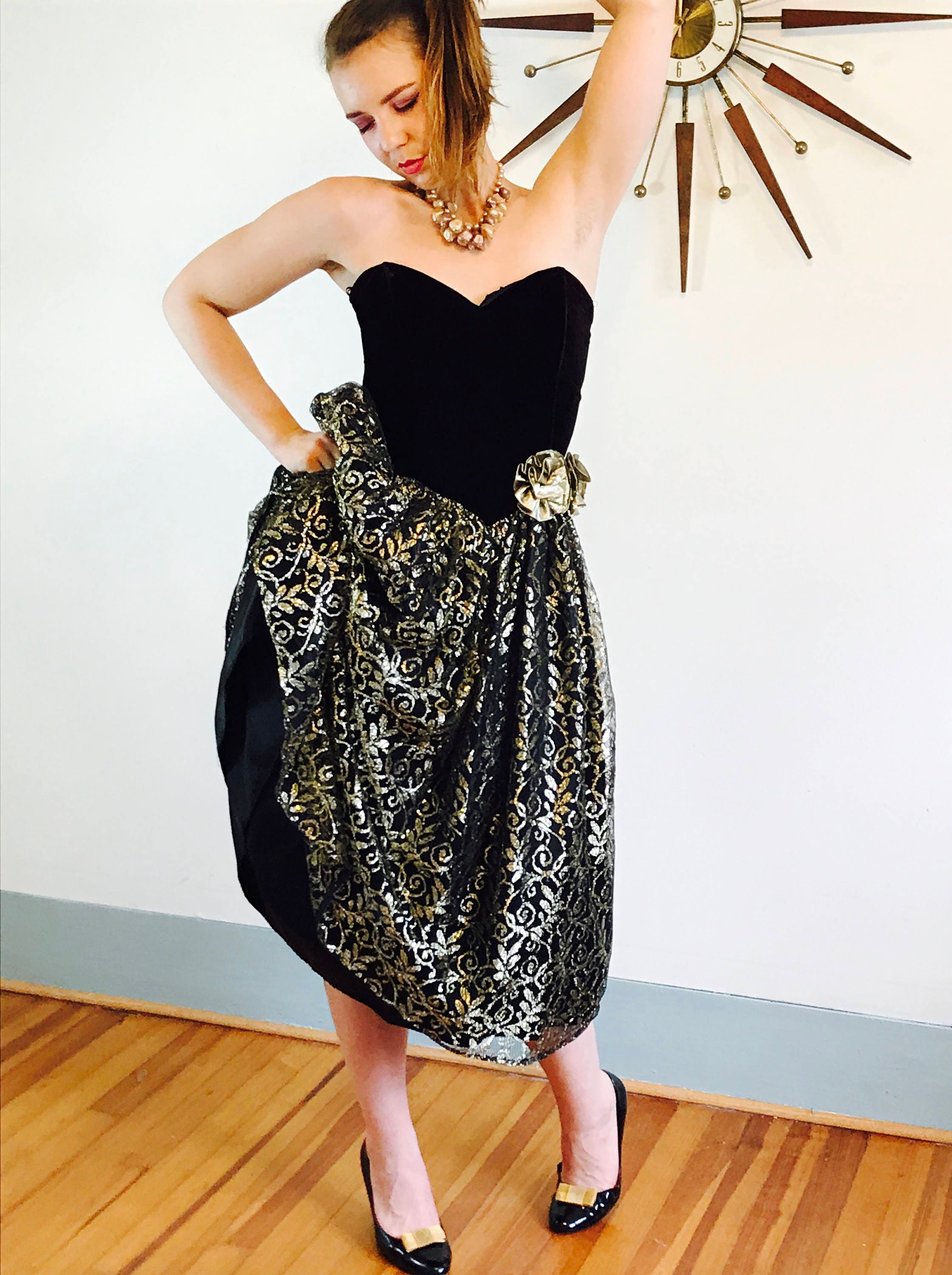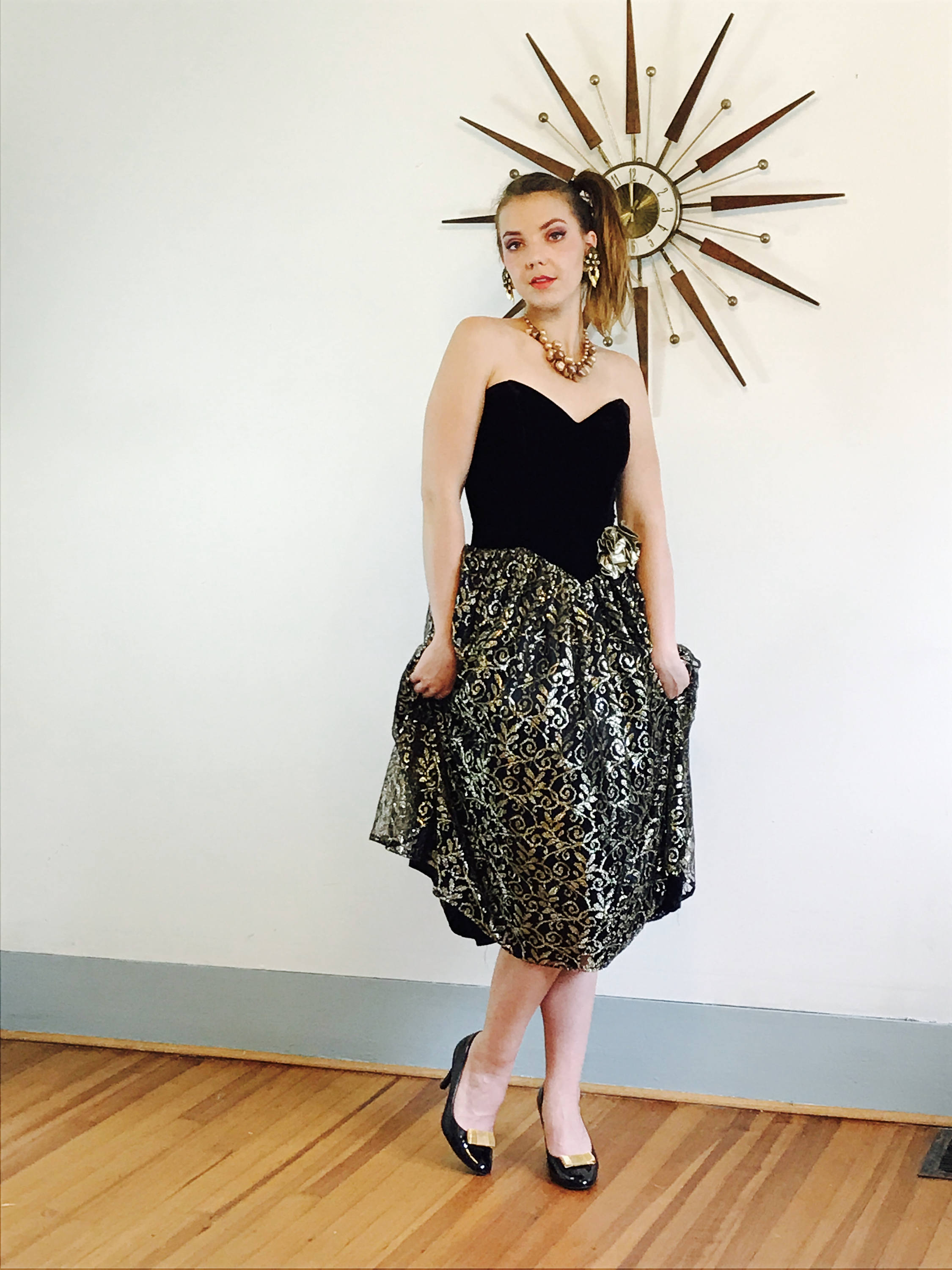 Black & Gold Party dress, 80s Gunne Sax Dress, Vintage Prom dress, Metallic Lace Bows, Strapless 1980s dress, velvet corset dress, SZ 6