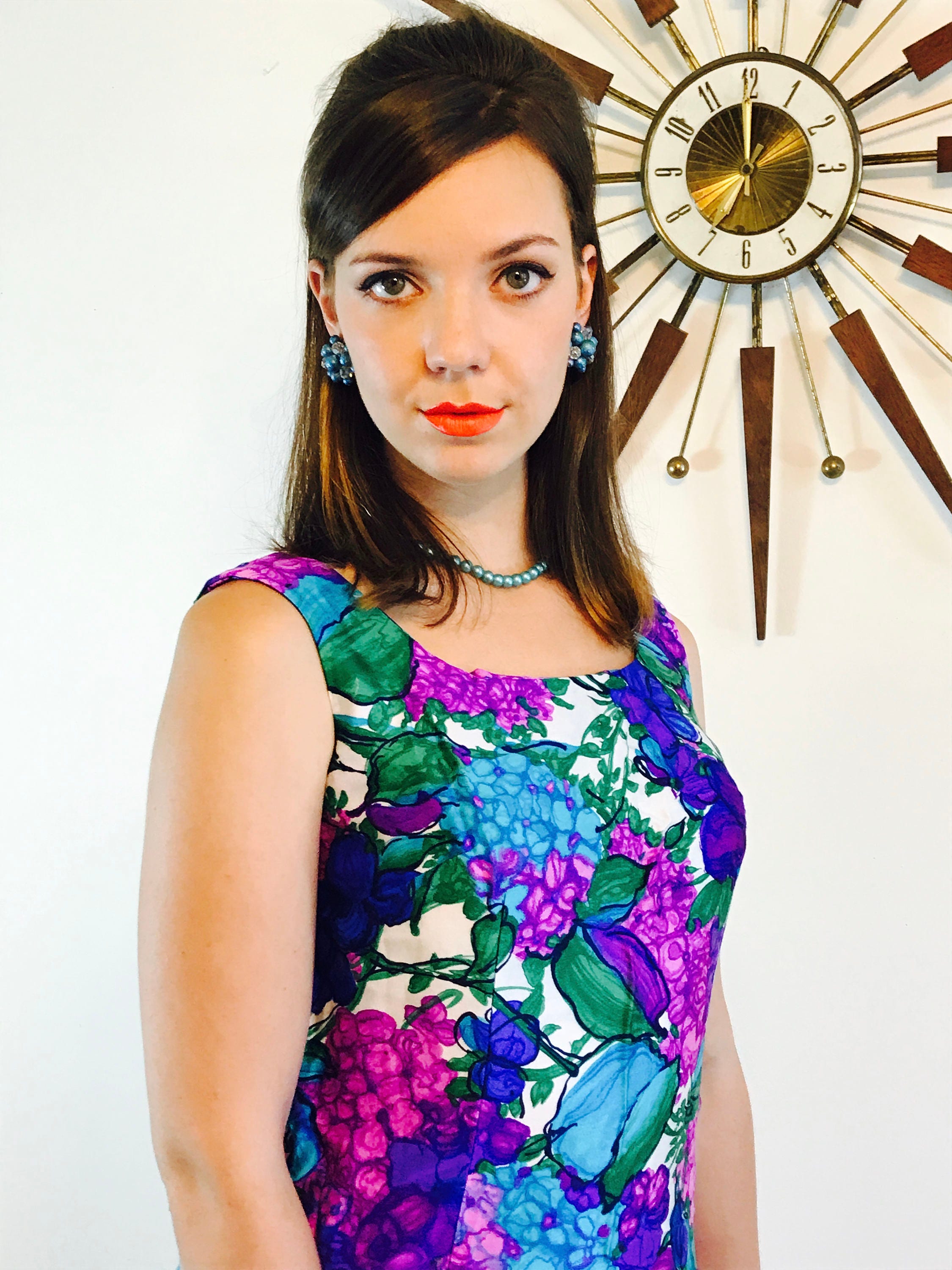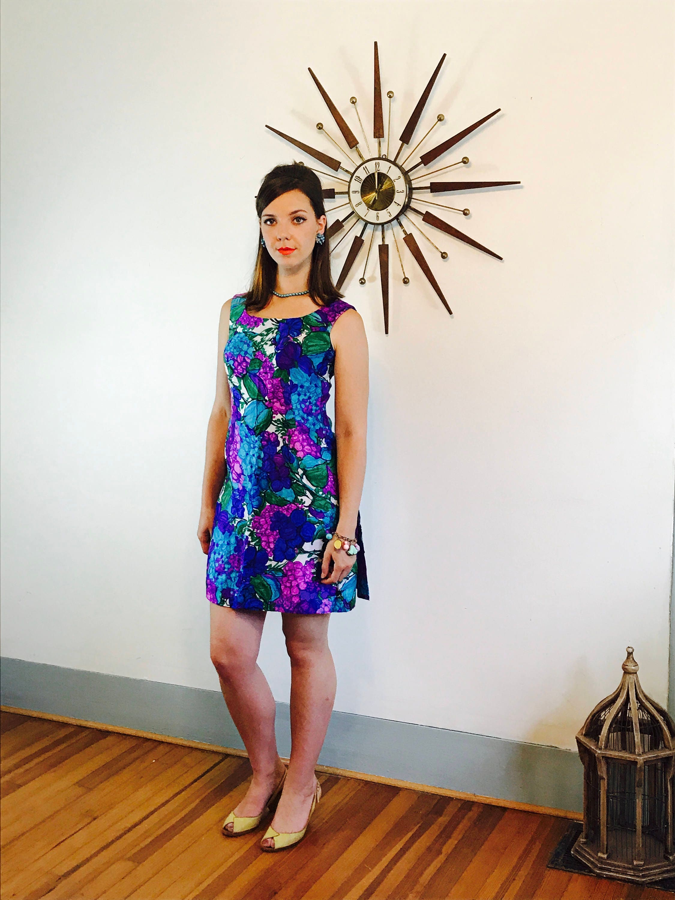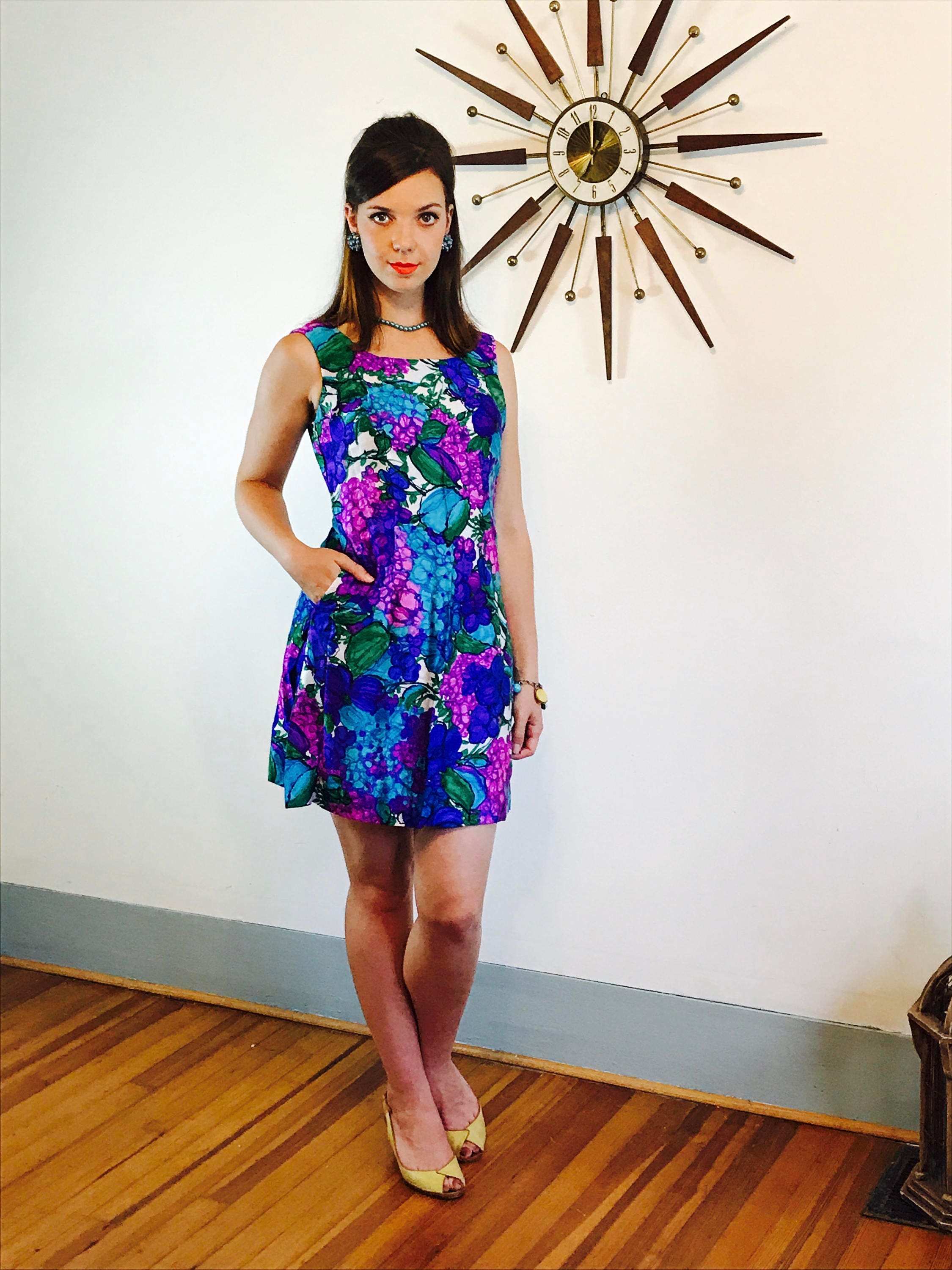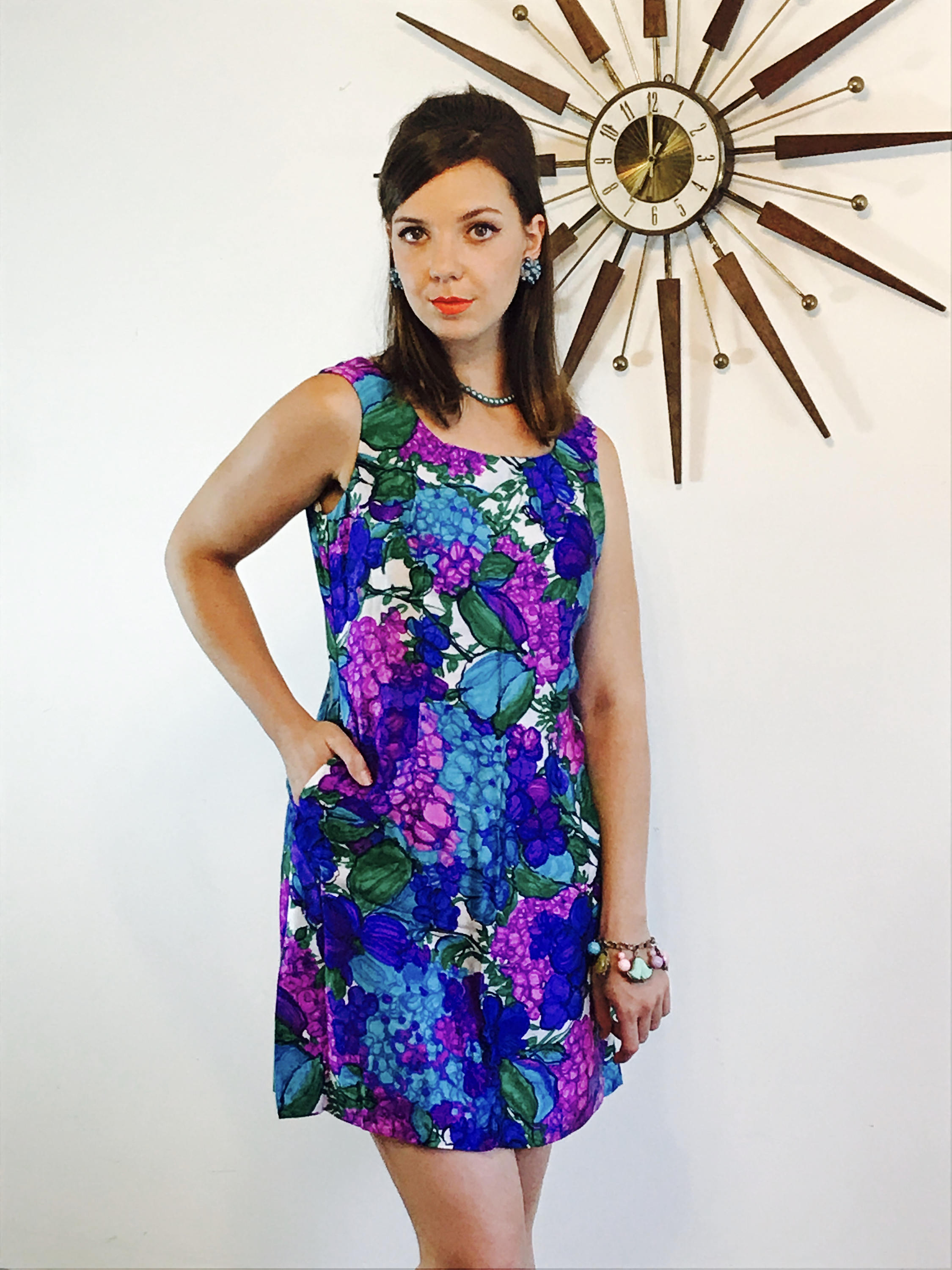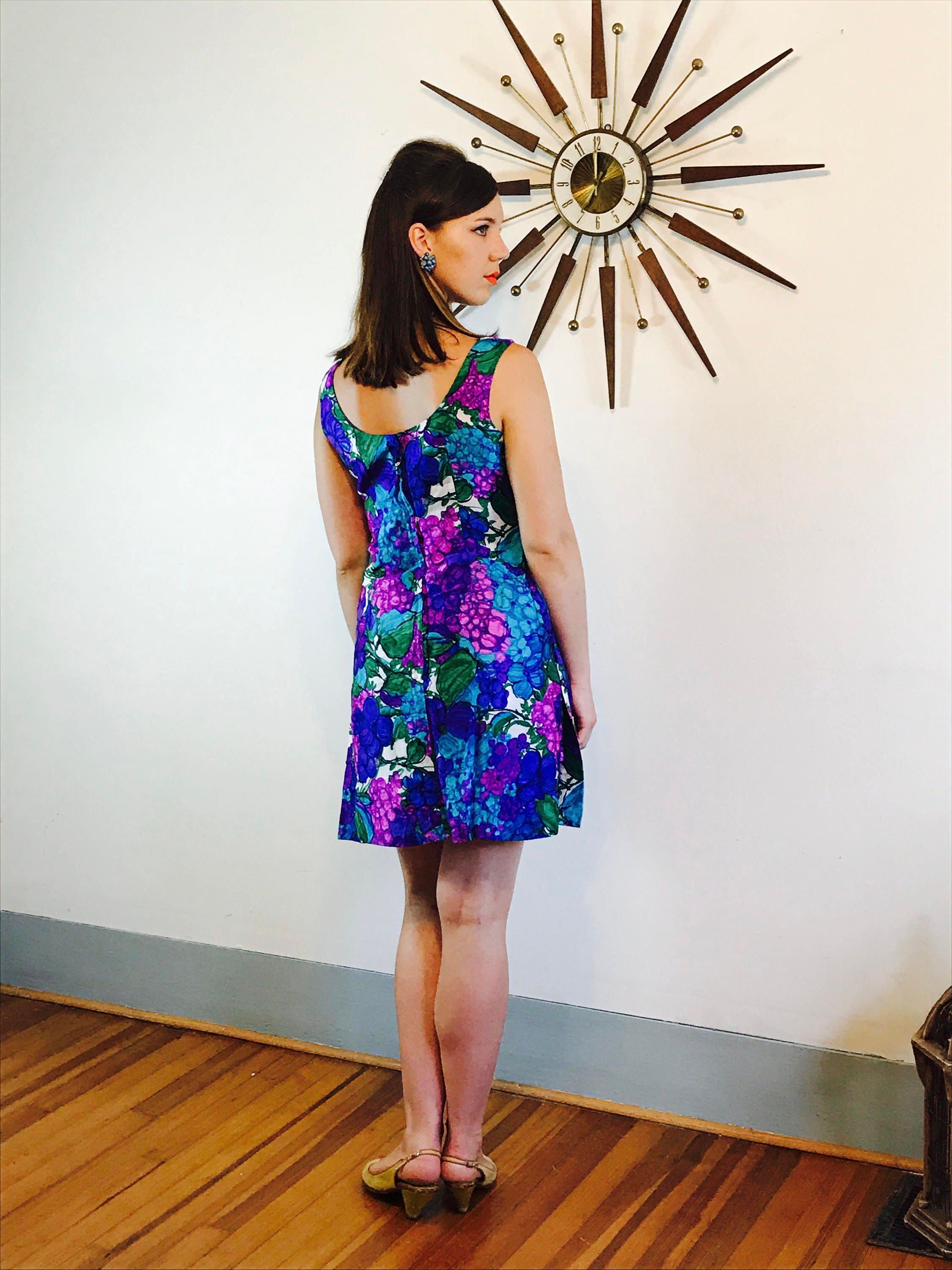 OMG! Hawaiian Heaven! This is such a sexy vintage 60s playsuit! This Hawaiian print dress and shorts set has a bright tropical floral print in blues and purples! This 60s micro mini, 2 piece outfit, is the perfect example of 1960s beachwear!