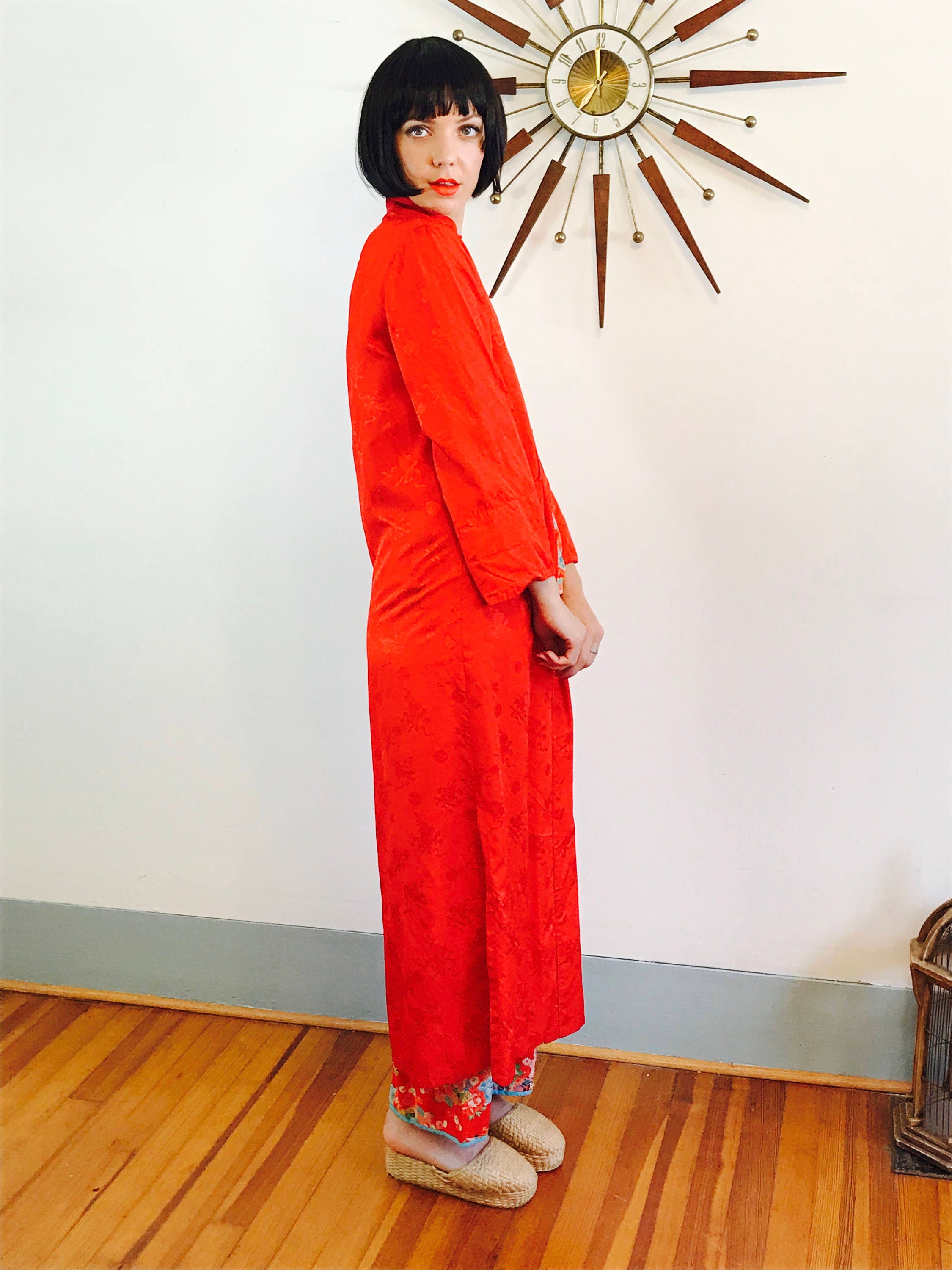 This is such a beautiful Long red Chinese robe! This vintage 20 robe is in the cheongsam style, with frog closures all up the front, a high Mandarin collar, beautiful pockets, and two long side slits! This lovely 1920s dressing gown is made by BAI HUA and is made from bright red satin brocade. This can Asian house coat can be worn as a robe or over an outfit as a long Cheongsam jacket!