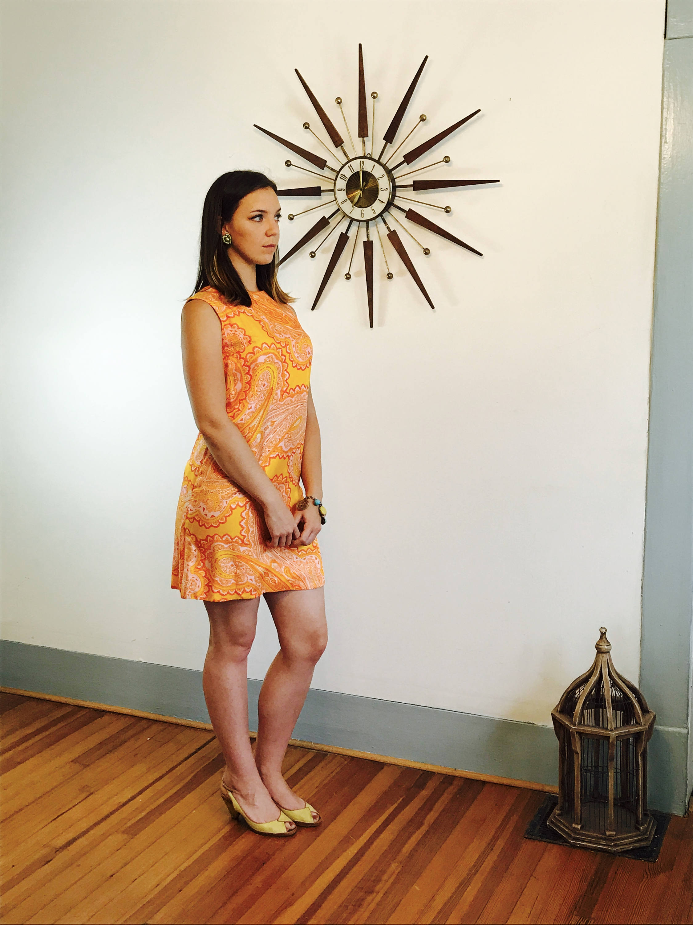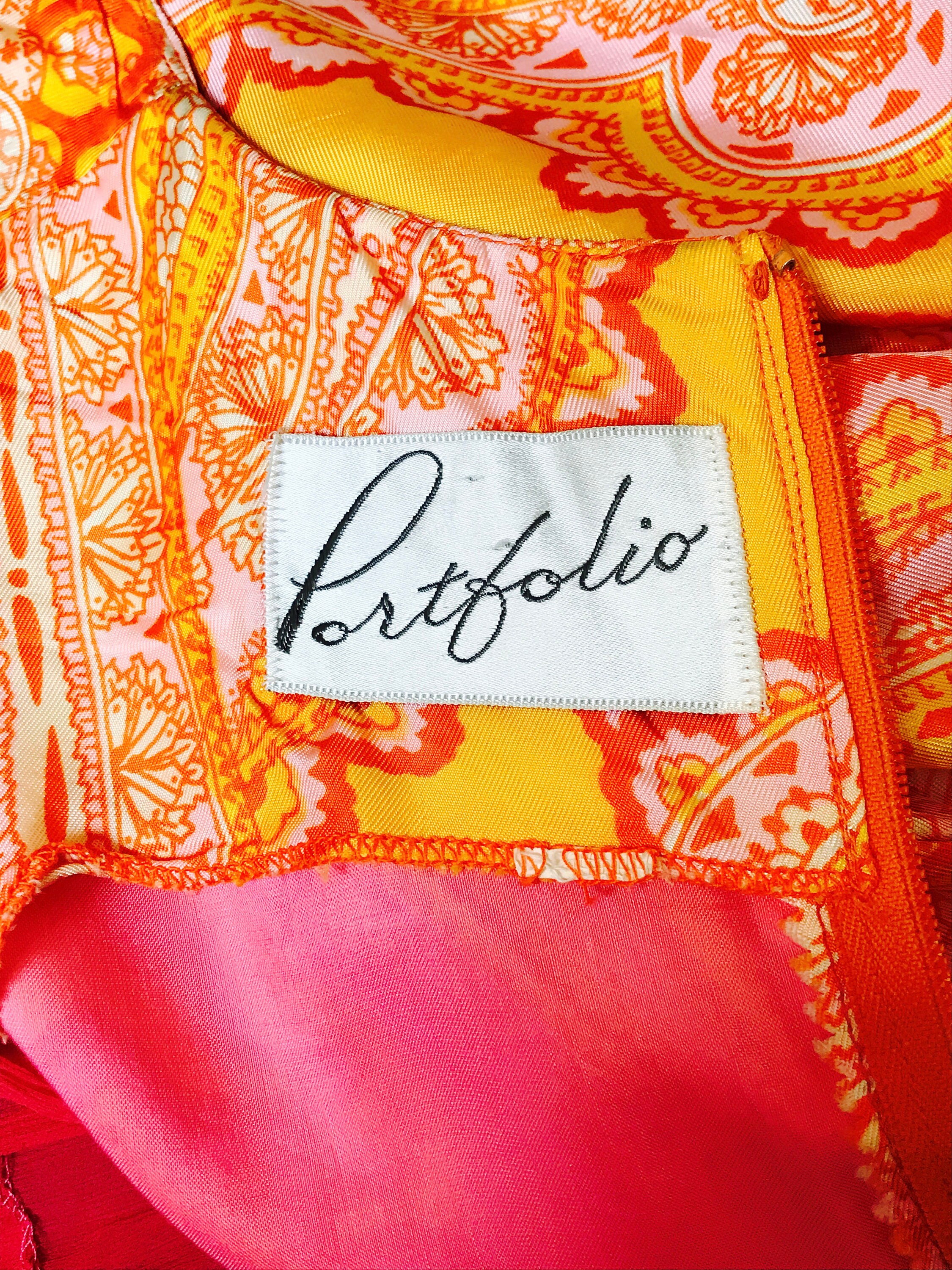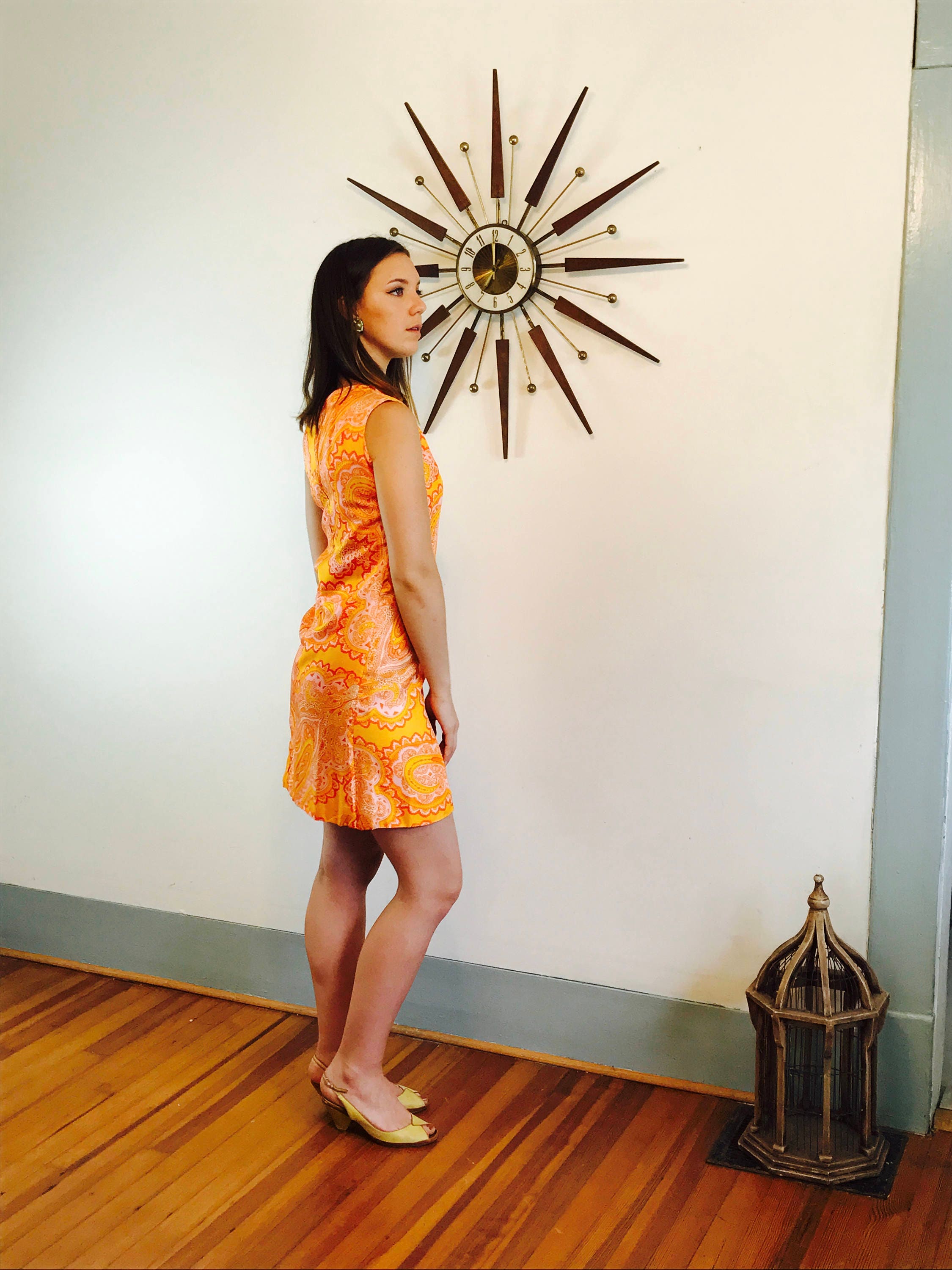 Vintage 60s Mini, 60s Mini Dress, PORTFOLIO, Orange Silk Dress, A-Line cut, Mod Mini Dress,bright colorful print, psychedelic paisley, Go-Go