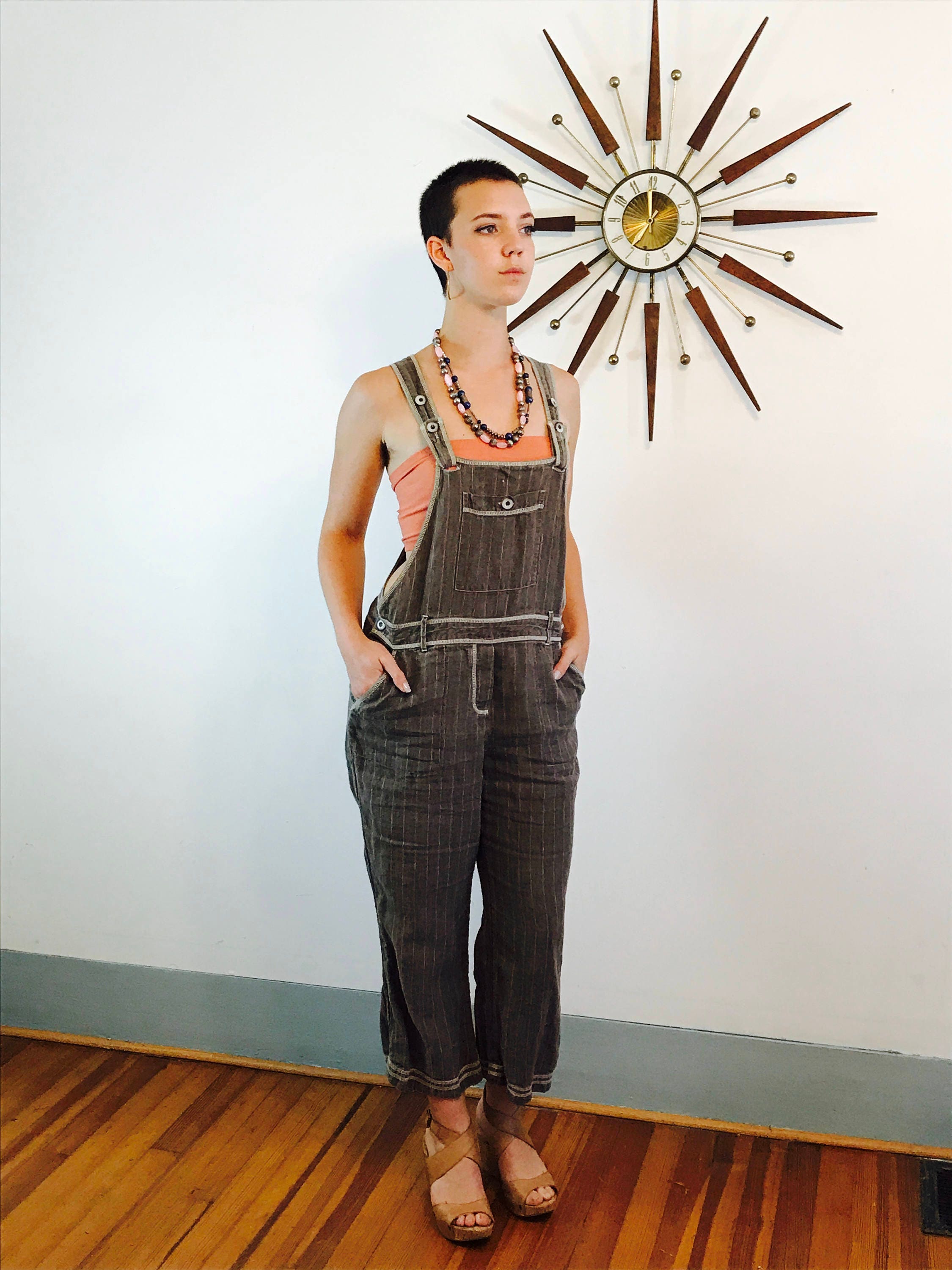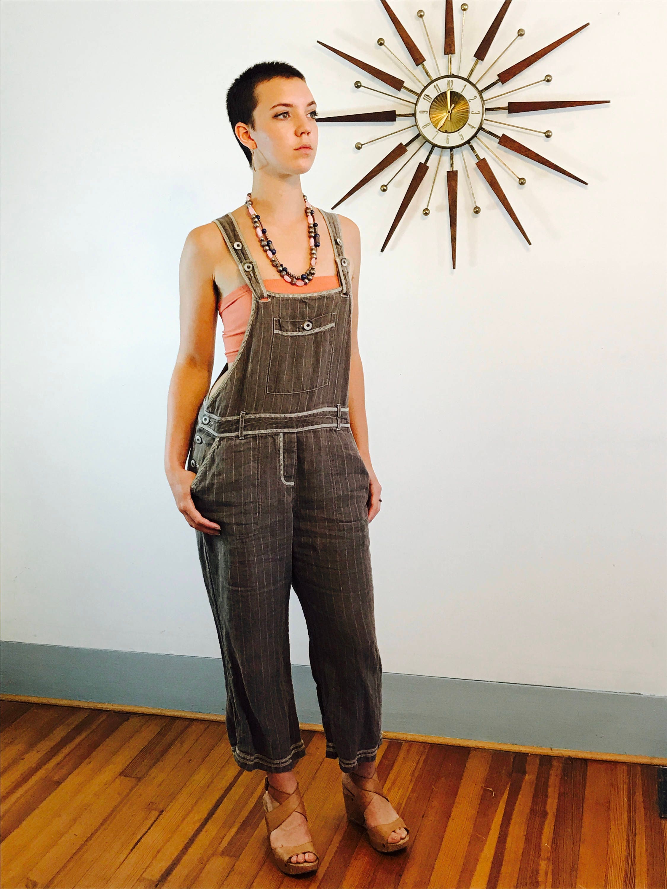 These are such cute Vintage 90s Overalls! These Khaki Linen Overalls are Brown and beige Cotton. This stylish Romper has adjustable buttons and pockets in front and back. This pair of women's overalls are by J. Jill and are from the 1990s. These bib front Coveralls are light weight and perfect for fall! These stone brown 1990s women's coveralls are too cute!